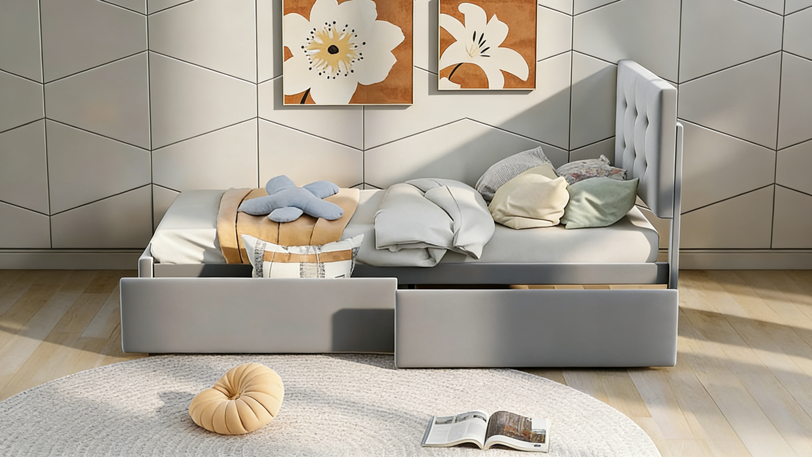 A sleek gray bed frame featuring integrated drawers for hidden storage, helping you maximize space and maintain a clean, modern bedroom.