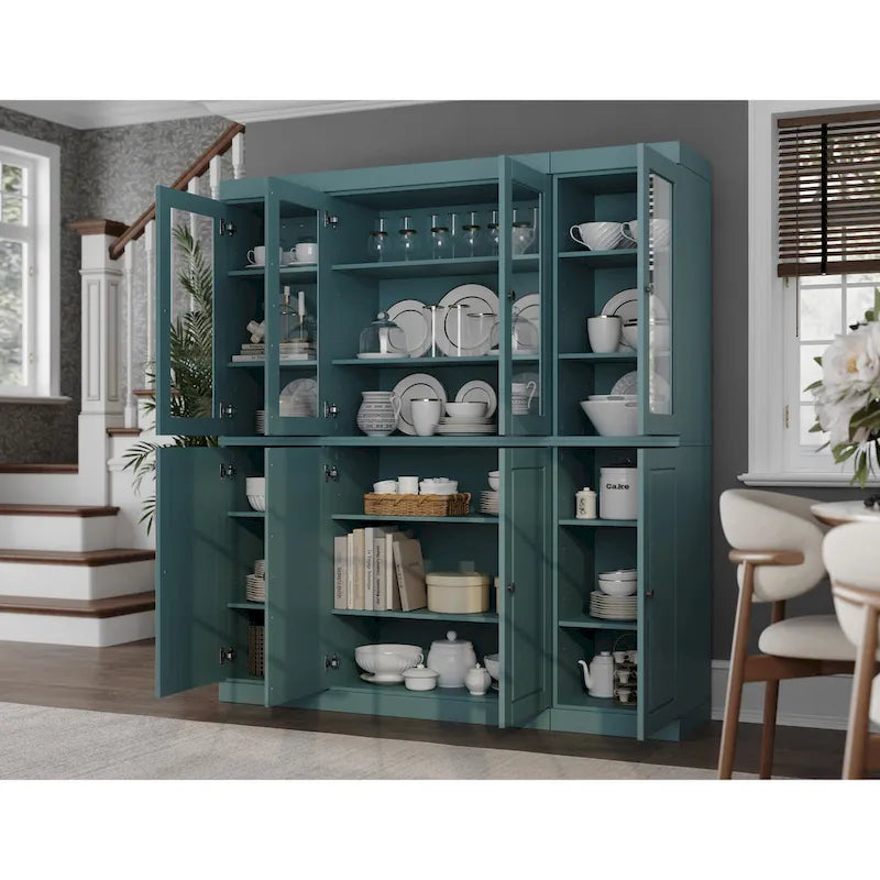 Introducing the 65 Wide China Pantry Buffet, a stunning addition to your kitchen that combines classic craftsmanship with modern functionality. Made entirely from 100% solid wood, this large pantry offers impressive storage flexibility with 4 large and 8 small adjustable shelvesperfect for organizing everything from bulky cookware to delicate pantry essentials. Plus, if you need even more storage, additional shelves are available for purchase, allowing you to tailor the space to your specific needs.