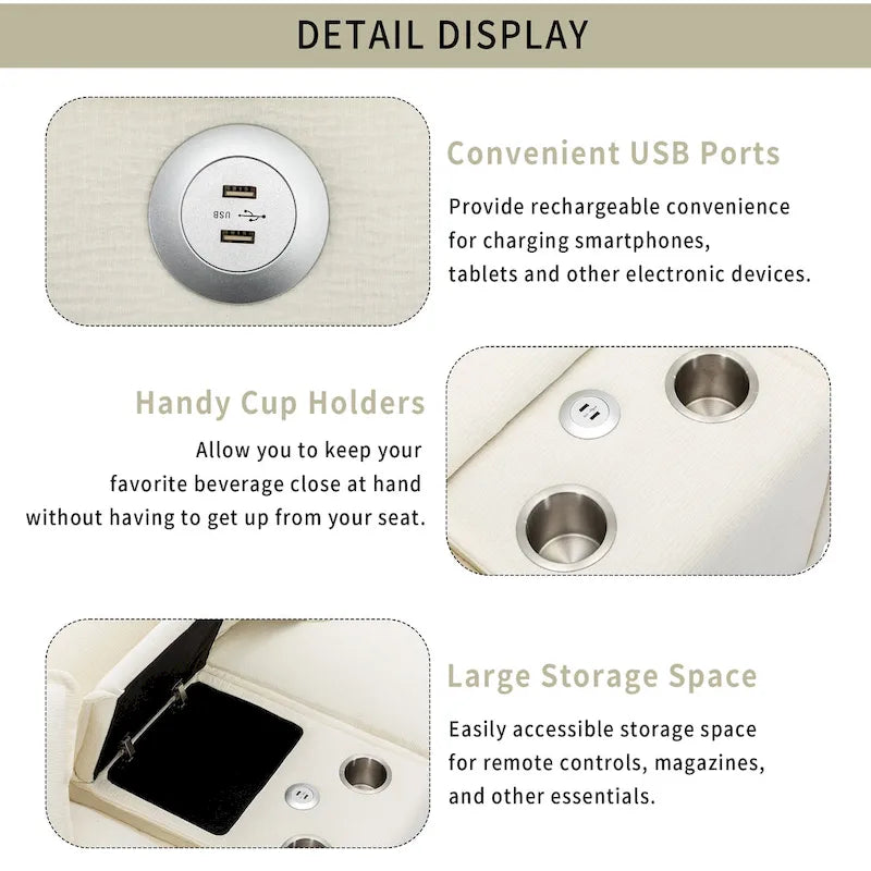 Double Cushion Design - The double cushion design gives you a more comfortable sitting experience. You can sit on the sofa to relax after a long day's work. Plus, The cushions you sit on are nice and firm. You'll never have to worry about sinking in. The more you sit in it the better. Two USB Port and Two Cup Holders - This sofa with USB charging ports ans two cup holders is a modern piece of furniture that combines comfort and functionality. Its USB charging ports provide rechargeable convenience for charging smartphones, tablets and other electronic devices. Two convenient cup holders located within reach allow you to keep your favorite beverage close at hand without having to get up from your seat. This feature is perfect for you to relax and enjoy your favorite drinks. Large Storage Space - This sofa features large hidden storage space, providing you with convenient and easily accessible storage space for remote controls, magazines, and other essentials. Two Removable Ottoman - The sofa equips with two convenient and versatile removable ottomans, allowing you to customize your seating arrangement according to your preference and needs. Use it as a footrest, extra seating, or as a chaise lounge extension for ultimate relaxation. 4 Pillows Attached - These pillows add a touch of warmth and elegance to the sofa, which can be used as a waist pillow and add an extra layer of comfort to you. Durable&Breathable Material - The cushion is wrapped with durable, breathable and non-pilling chenille fabric, which not only ensures longer use time but also is friendly to pets. Notice: The resilience performance of this product is affected by the weather. Please do not worry about it when you receive the product. 72 hours are required for the product to resilient. An ironing machine can iron the wrinkles.