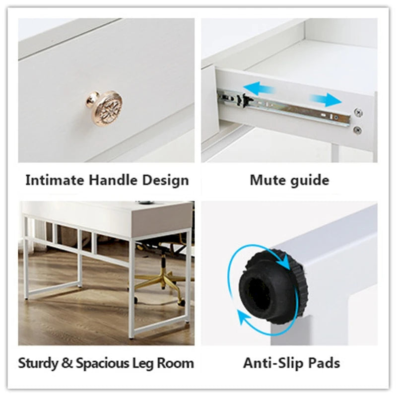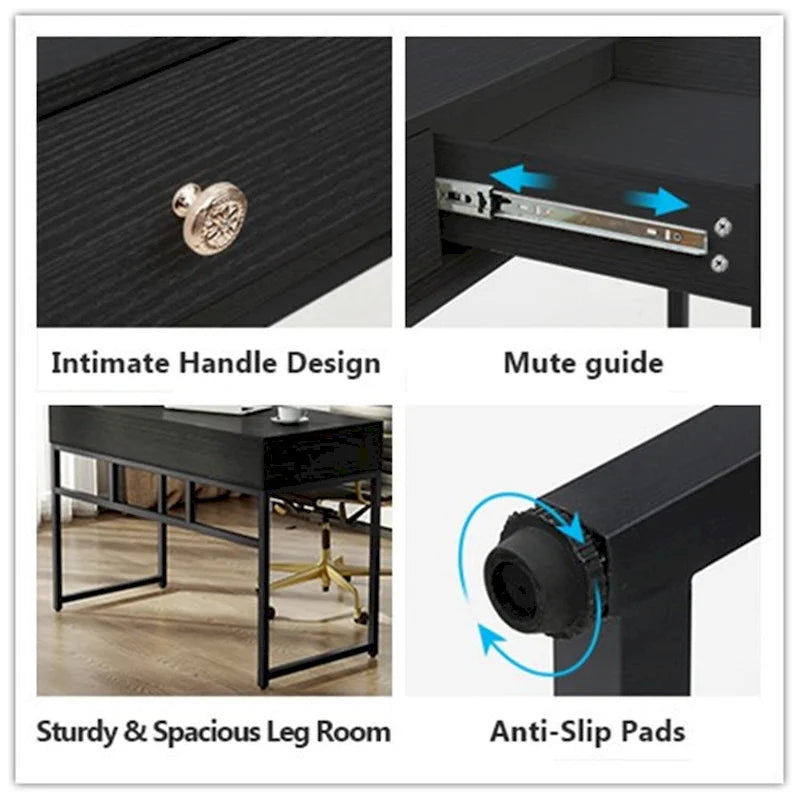 Upgrade your home office with our 47 inch Home Office Desk Study Writing Table with 2 Storage Drawers. With a minimalist design featuring attractive golden metal legs and clean lines, this desk will naturally match most interior design schemes. The spacious 21.65 wide desktop provides ample surface space for all your home office activities, from gaming to writing to applying makeup. The two large capacity drawers, 22.8 in length and 2 3/4 deep, give you plenty of storage space to keep your office supplies and even your MacBook (11-15) organized. Made of strong power coated steel frame (0.98) and thicker laminated MDF desktop board, this desk is super sturdy, stable, and ready for long days and nights.