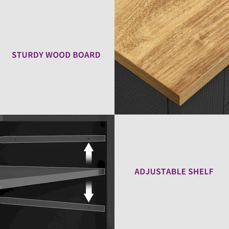 Our Tilt Out Trash Can Cabinet is an essential addition to your kitchen, housing a 13-gallon trash can and keeping your space fresher and cleaner. It offers extensive storage with 2 drawers and 3 side open shelves, and features lockable rolling wheels for convenience. This versatile cart, built with CARB Phrase II certified MDF boards, can serve various functions, from a kitchen food & coffee bar to a prep counter workstation.