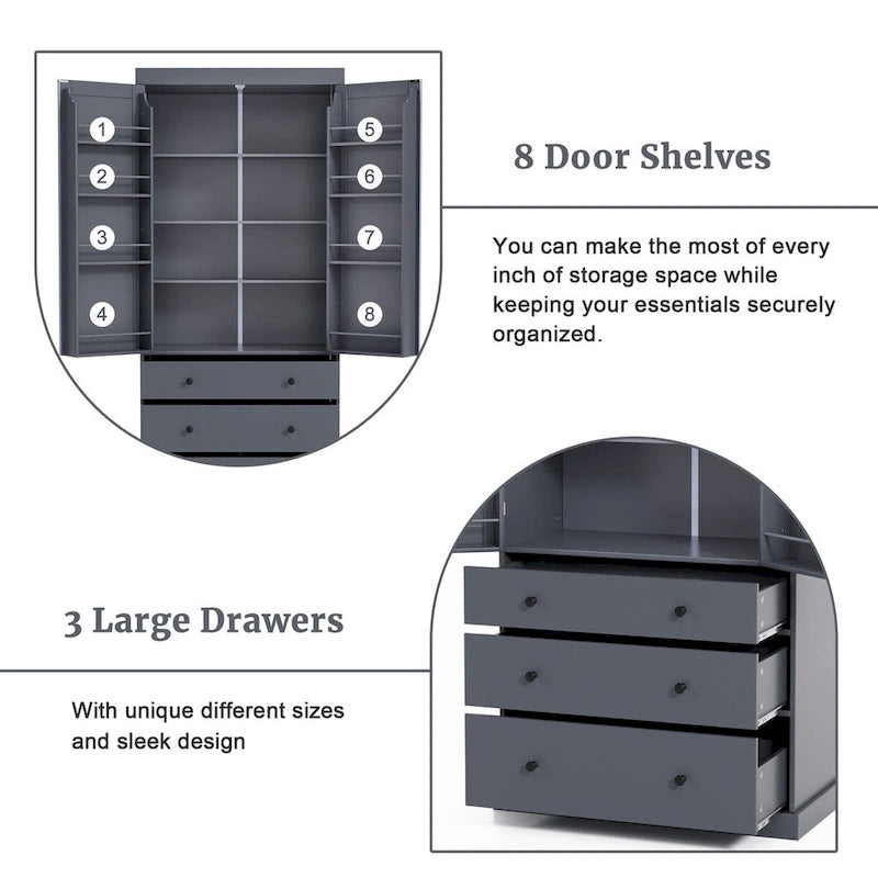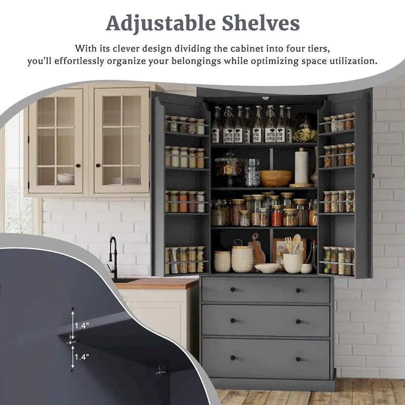77inch Farmhouse Kitchen Pantry, Freestanding Tall Cupboard Storage Cabinet with 3 Adjustable Shelves, 8 Door Shelves, 3 Drawers