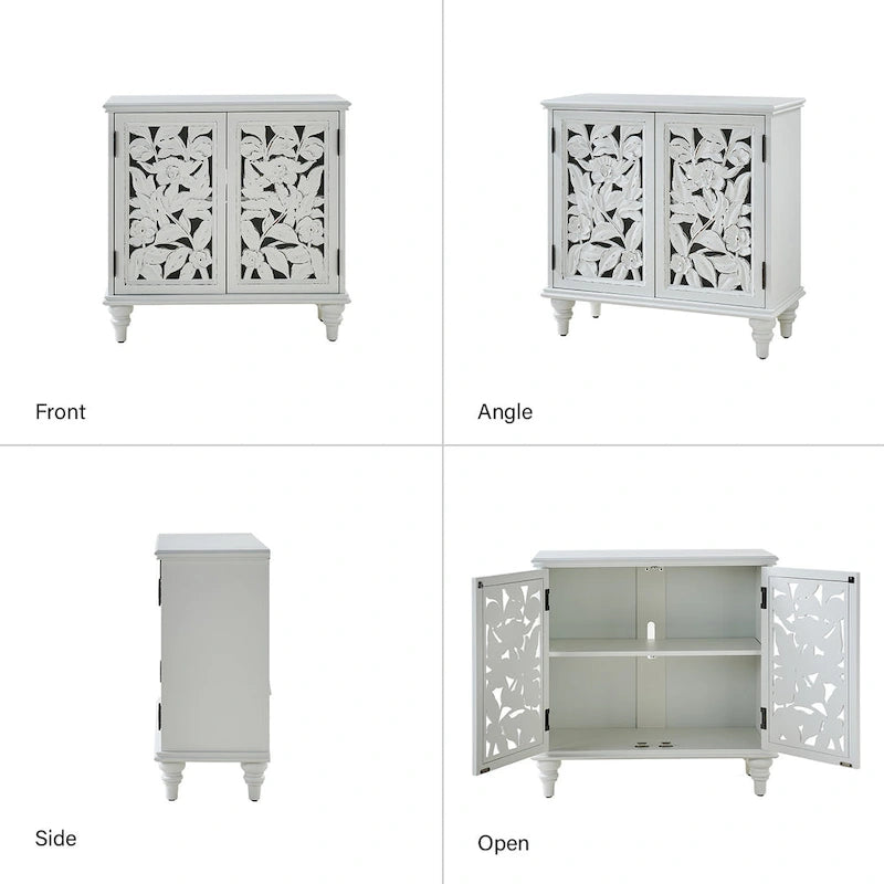 - Exquisite Carved Medallion Doors: The cabinet doors feature a beautifully carved medallion motif, showcasing floral and botanical patterns in a solid hue. The distressed finish adds a rustic charm, giving the piece a vintage appeal that instantly enhances the aesthetic of your space.