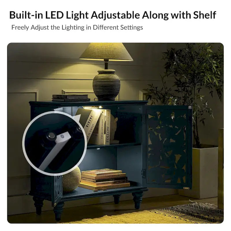Introducing the exquisite cabinet, a versatile addition to your home that seamlessly combinestraditional, transitional, and farmhouseaesthetics. Meticulously crafted to enhance the ambiance of yourliving room, bedroom, or entryway, this piece offers a perfect fusion of style and practicality. One of its exceptional attributes is the intricatelycarved medallion design, showcasing a captivating motif featuringfloral and botanical patterns against a distressed solid hue. IntegratedLED lightingadds to its allure, creating a warm and inviting atmosphere, perfect for displaying your favorite decor. The discreetcable managementensures convenient electrical access, whileadjustable shelvesprovide adaptable storage solutions. Withsolid wood spindle legs,adjustable feet, andhigh-quality hinges, this cabinet guarantees durability and stability, complemented by the delightfulpush-to-open mechanism. Elevate your interior with thistraditionalpiece that elegantly unites form and function.