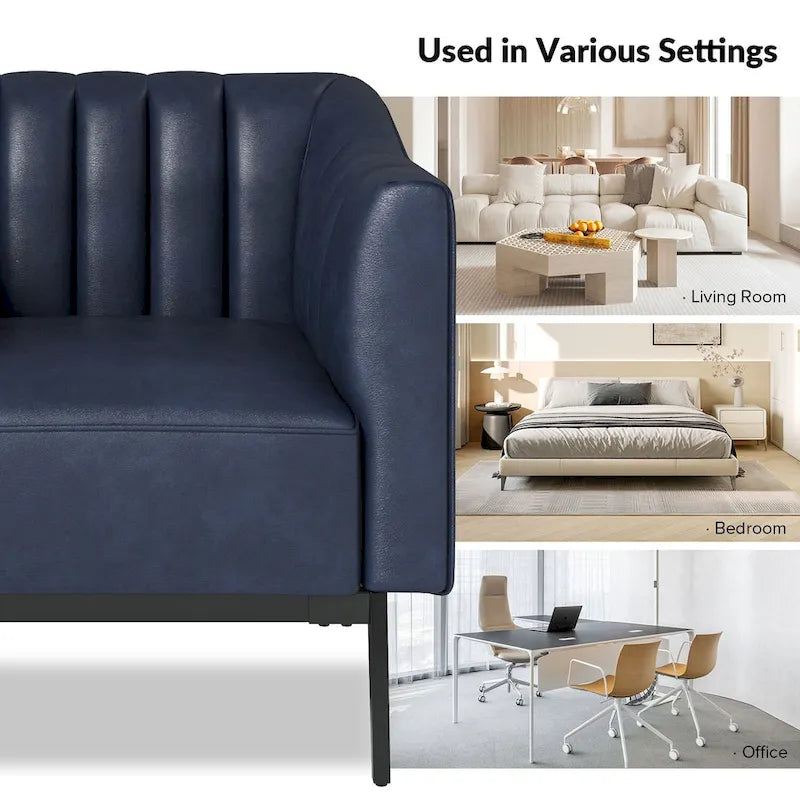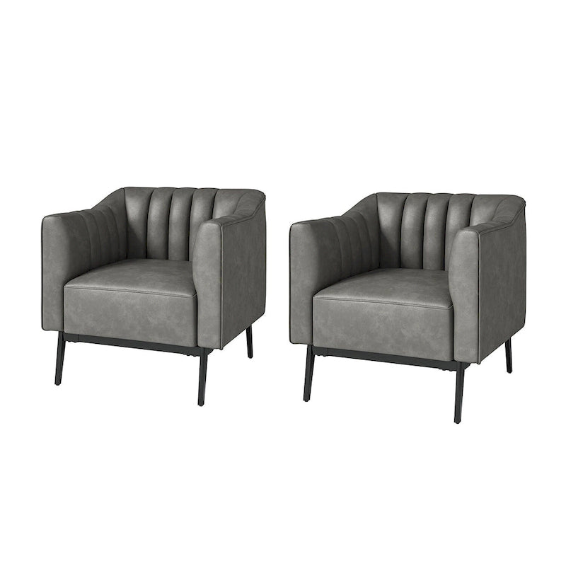 Immerse yourself in the industrial chic with this exquisitely designed accent chair set. Upholstered in quality PU leather, this chair set is waterproof and easily cleanable surface ensuring a worry-free experience. Supported by sturdy metal legs, the chairs offer reliable stability and robust support, ensuring longevity. The vertical channel tufting on the chairs enhances both comfort and visual appeal, creating a visually appealing texture that complements the overall aesthetic. The solid back provides ample support and comfort, making it a good choice for long hours of relaxation or work. Elevate your living or office space with this practical chair set that combines industrial charm with contemporary comfort.