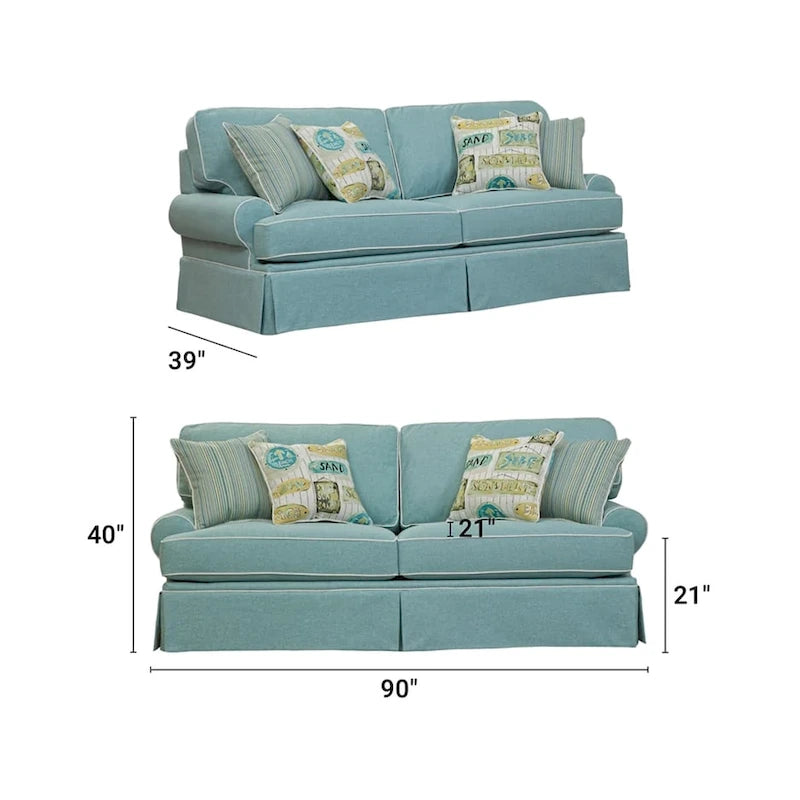 Bring a touch of elegance to your living room with our American Furniture Classics Model Coastal Aqua Series Sofa. This classic round arm sofa features a beautiful aqua color with ivory contrast welt, perfectly tailored with attention to detail. The reversible two over two seat and back cushions are designed for wear and tear, while the tailored skirt adds a touch of traditional charm. The durable poly blend fabric has the look of natural linen and is accentuated by four beach patterned pillows on an ivory background. This sofa seats three people comfortably.