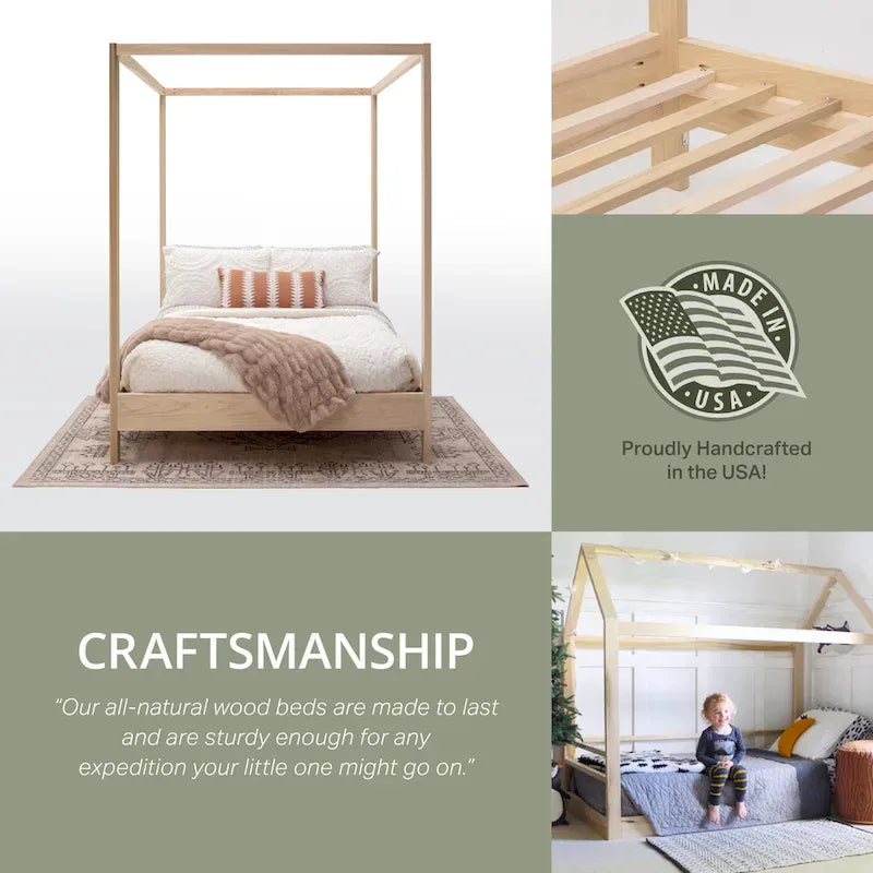 Simple, elegant, timeless design for your trendy bedroom. This canopy bed truly provides just the right amount of depth and awe without stealing the entire appeal of the room. This is a sturdy product made from unfinished solid knot free furniture grade poplar. You can stain or paint any color you wish or you can leave the item unfinished. Your bed purchase plants trees too! We plant one tree for every bed sold through One Tree Planted foundation! Available in twin, full, queen, and king size.
