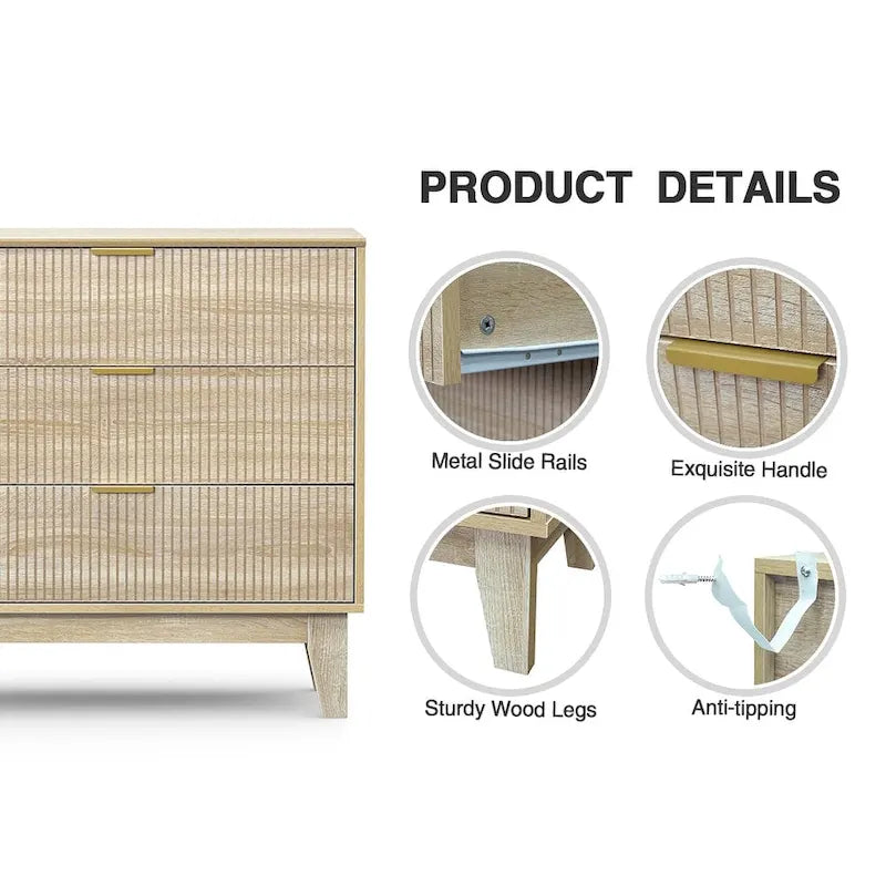 This chest of drawers features a simple construction with a textured fluted design and metal handles that exude a modern yet elegant vibe. The bedroom dresser has three storage drawers, providing plenty of room to store books, blankets, toys, clothes, etc, maintaining a clutter-free living space. Elevate your home with the natural oak color and simple design, making it even more versatile and suitable for any home style, giving your room a cleaner and brighter look.