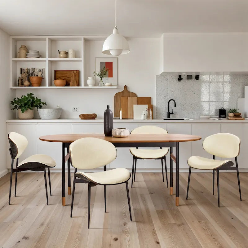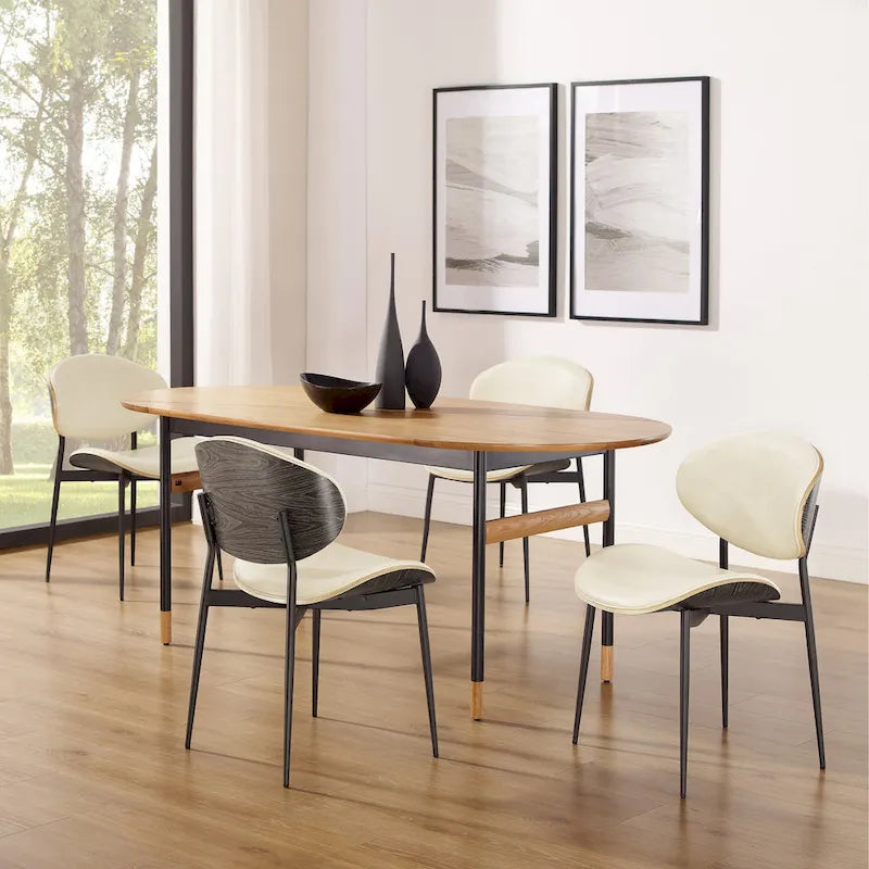 Add a touch of minimalist charm to your dining space with Art Leon Mid-century Modern Dining Chairs. These chairs feature a curved, polished bentwood seat and back, upholstered in faux leather, and sleek metallic legs, creating a stylish and ergonomic seating option. The bentwood back and seat offer rugged, smooth, and ergonomic support while the foam-padded seating ensures gentle comfort. Available in two color options, these armless chairs are lightweight and easily moved, each holding up to 300 lbs.
