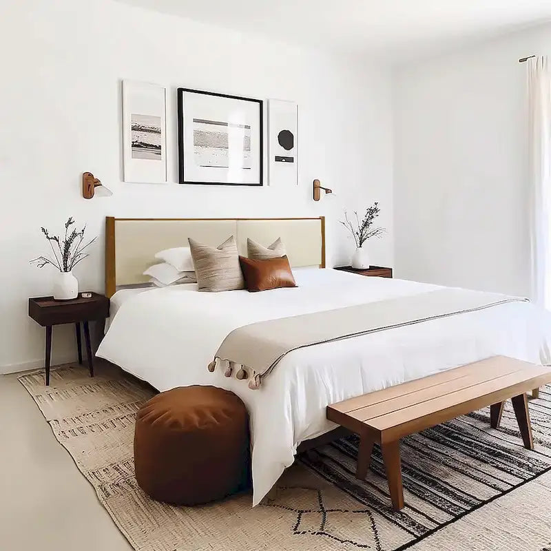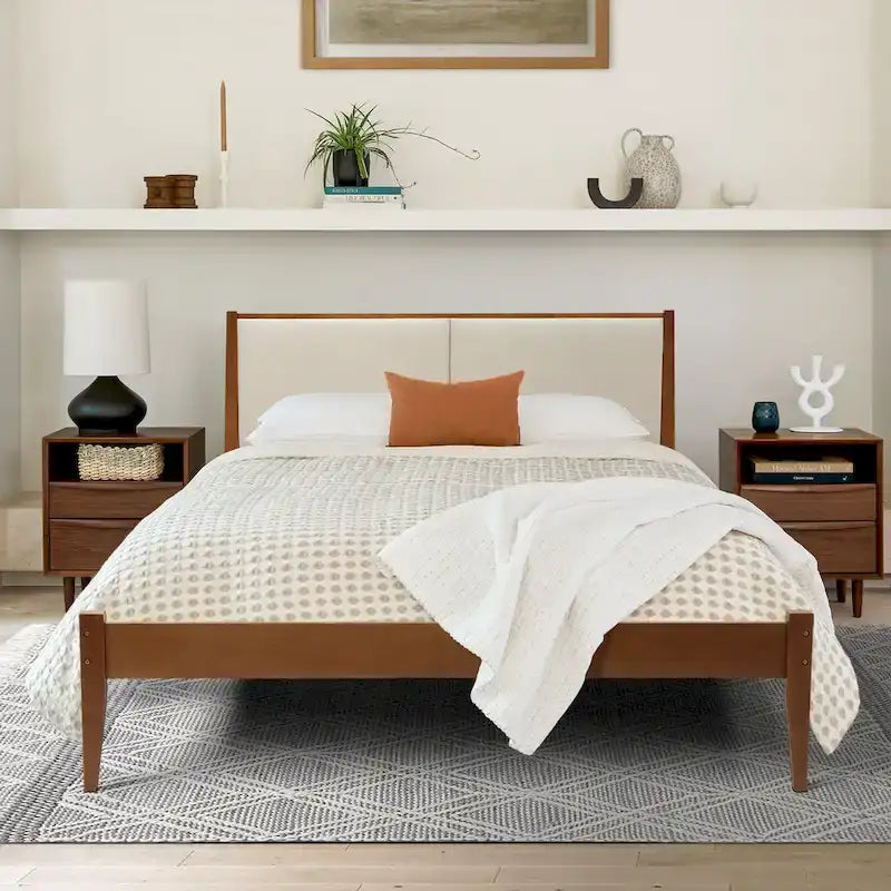 - The bed set includes an upholstered headboard and wood frame