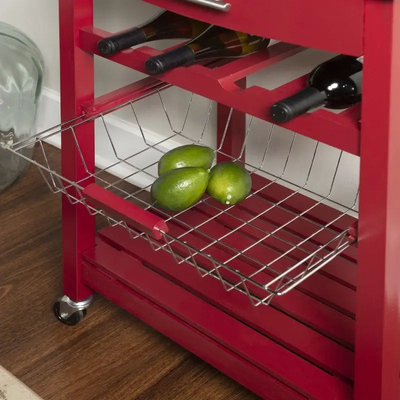 Expand your kitchen workspace with the Brooks Carts. A single pull out storage drawer, wire basket, wine bottle storage rack and single shelf, provide ample storage space for all of your kitchen essentials. Durable castors make for easy mobility throughout your space and lock for safety.Choose from four finish options to add a pop of color to your space. Ideal for small spaces.