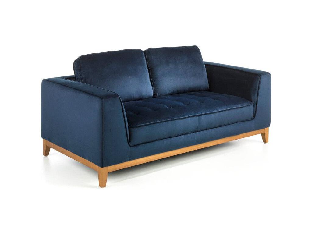 Two-seater sofa in blue velvet-effect fabric and walnut wood