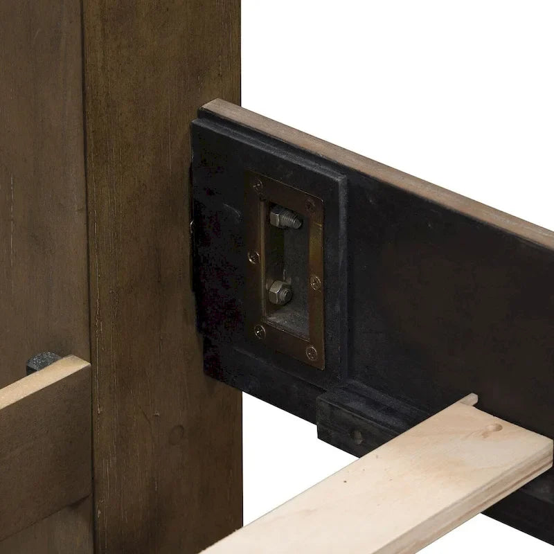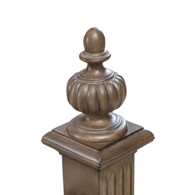 Indulge in luxury with the Carlisle Court poster bed. Crafted with excellence using rubberwood solids and rustic hickory veneers, this bed features a Chestnut with Gray Dusty Wax finish. Fluted square turned posts are framed with acanthus leaf carved accents along with decorative top finials. The headboard has an arched crown and is upholstered in a button tufted Sand Linen chenille fabric with a nail head trim. The top center crown is highlighted with a carved pediment. The poster footboard is arched and features bead molding and carved acanthus leaves. Use the poster bed rails which feature bolt-on support to complete the bed. Combine the grand feel of the past with today's luxurious lifestyle with the Carlisle Court poster bed.