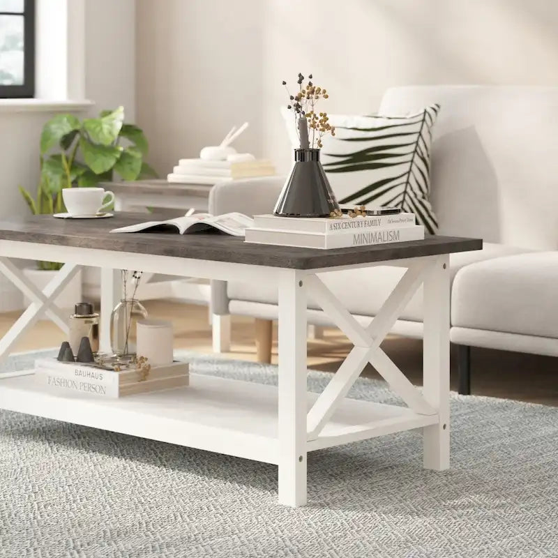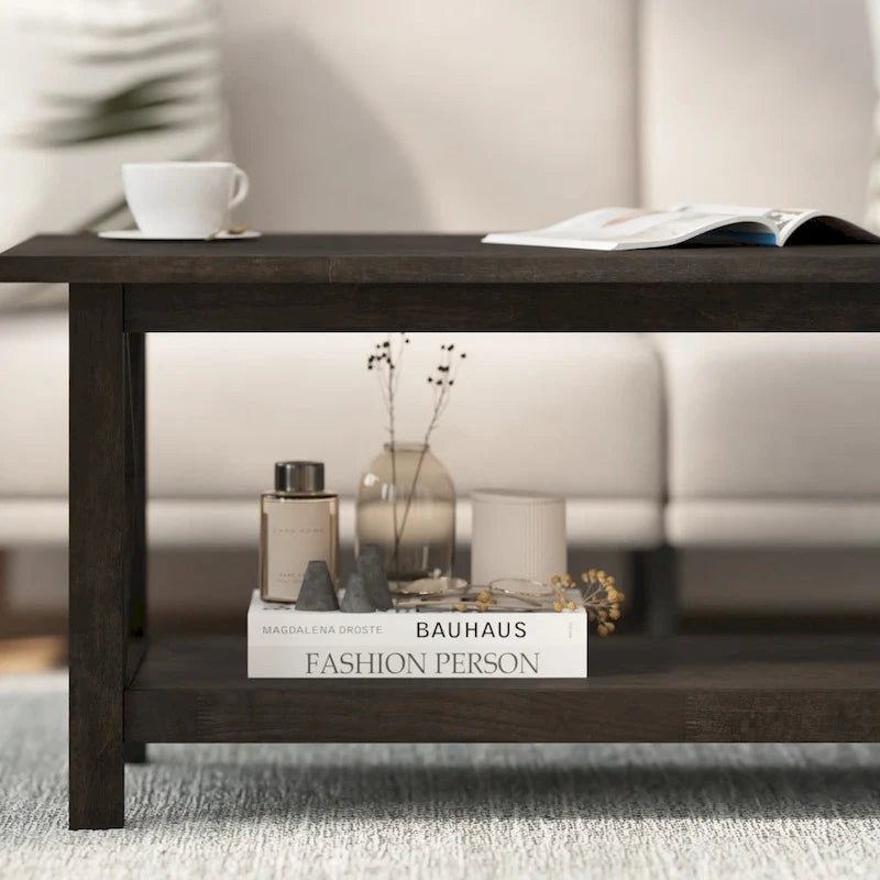 Embrace classic charm and modern functionality with our traditional farmhouse coffee table with lower storage shelf. Crafted from solid wood with a stunning finish, this piece is a timeless addition to any room. It brings an air of refinement and sophistication to your living space, while the practical design provides ample surface area for lamps, books, or drinks. Assembling in under 30 minutes, it's the perfect blend of convenience and quality. The easy-to-clean surface continues the hassle-free theme. It's not just a table, it's a statement of good taste for any discerning homeowner.