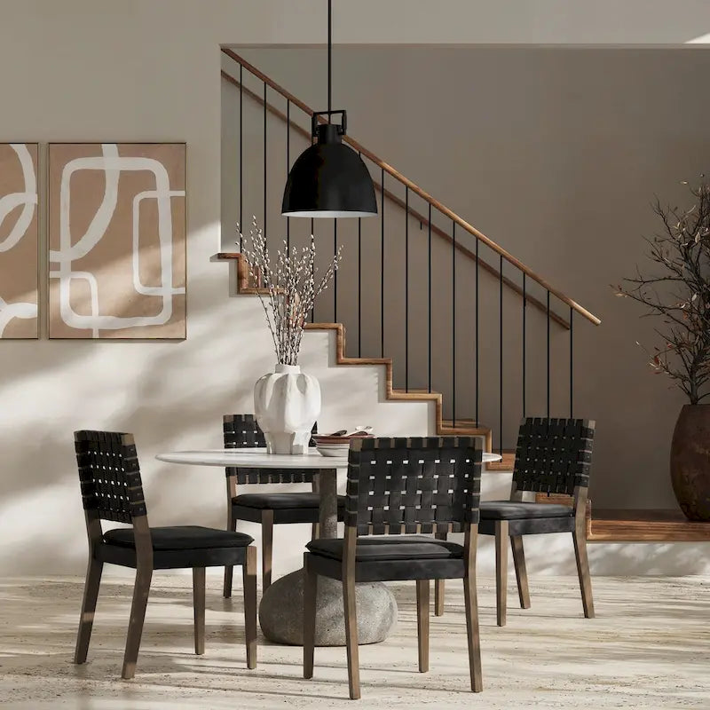 Introducing the Cohen dining chair, a stunning blend of style and comfort for your dining area. With a comfortably low 19 seat height, this upholstered dining chair is thoughtfully designed to make your dining experience extraordinary. It features a comfortably padded saddle seat upholstered with high quality faux leather. The legs are made from solid rubberwood in natural finish, making each piece truly unique. And the star of the show, Cohen's hand-woven faux leather backrest, not only adds a touch of artisanal beauty but also provides excellent comfort. Due to characteristics of natural wood, each piece is unique and products will have variations in color and texture.