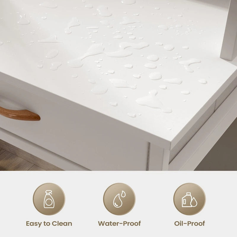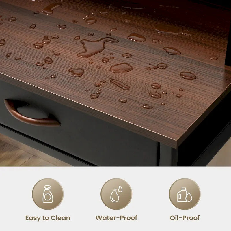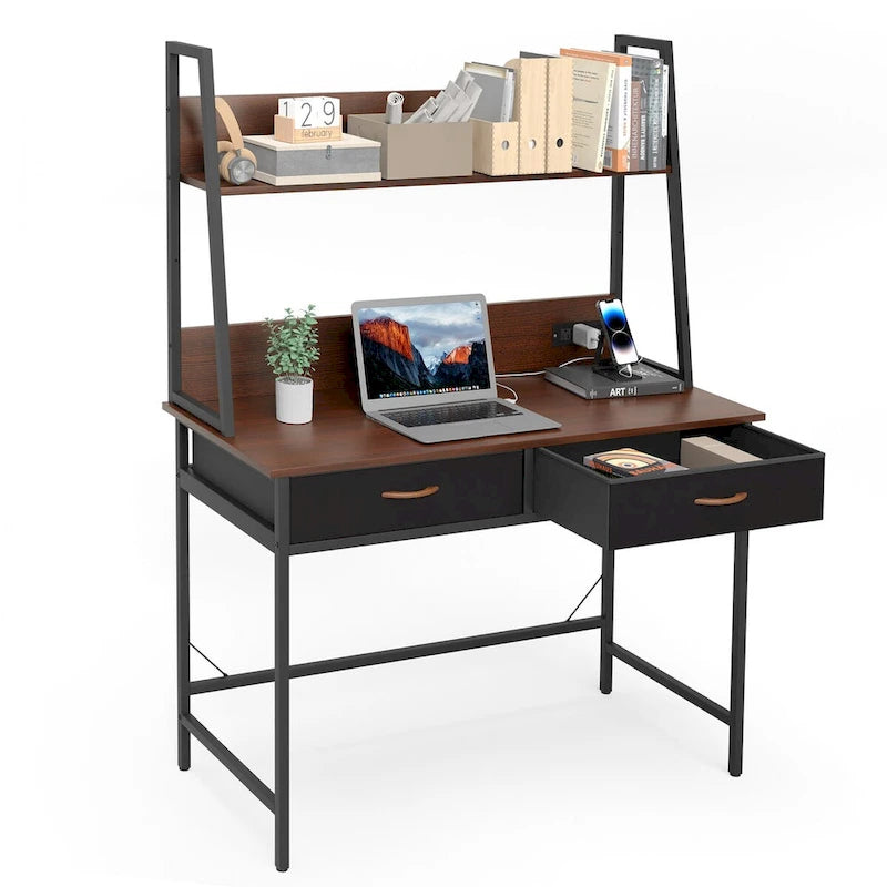 Upgrade your home office with this computer desk with power outlet and bookshelf, perfect for studying, writing, or working from home. Create a versatile workstation with this all-in-one computer desk with 2 fabric drawers, a top storage shelf to maximize your workspace while saving floor space. Round out the sleek top shelves with books, artwork, potted plants, and framed family photos for an eye-catching display. With 2 drawers, it can tuck your mess out of sight and keep the office desk neat. Its compact but stylish design makes it fits well with any home decor.