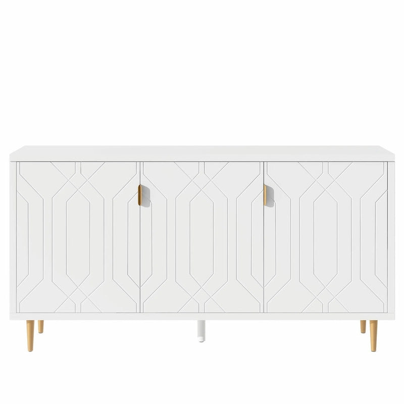 Embrace the elegance of Scandinavian style with this sleek white sideboard cabinet. Its clean lines and minimalist design make it a perfect fit for contemporary and modern decor. Boasting 3 doors and 3 adjustable shelves, this cabinet effortlessly organizes DVDs, game consoles, magazines, and more. Crafted from durable MDF and particle board, its fluid pattern inset on the door fronts and tapered metal legs contribute to its playful and contemporary appearance.