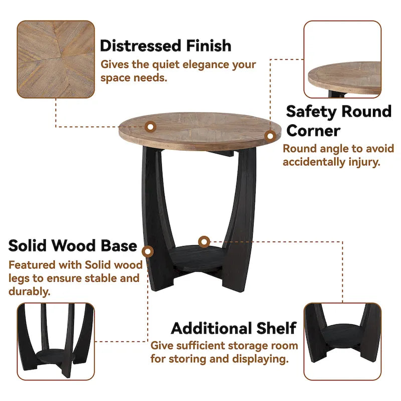 Bring old-world character to your interior space with the COZAYH Rustic Farmhouse End Table. The table's graceful curves and distressed wood finish add a rustic French country touch to any country cottage, farmhouse, or antique themed home. The sturdy table is made of solid and manufactured wood, ensuring steady support and stability for years to come. Its round silhouette with a smooth, thick edge top rests on four graceful legs, embellished with veneer trimming in a vintage black finish. Use the shaped surface top to display your favorite decorative items, while the lower round shelf can hold small items or a petite basket.