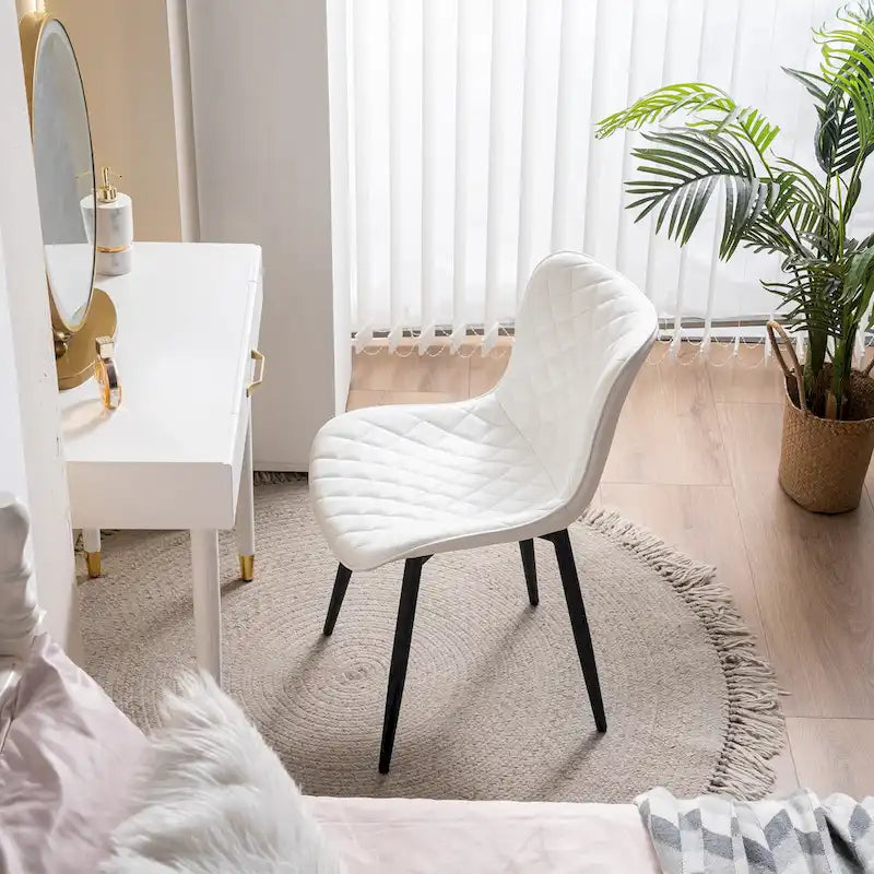 Surround your dining space with a set of chairs that not only bring your decor to life, but also follow the body's curves for added comfort. Featuring lovely diamond-shaped stitching, a leather upholstered seat and a sturdy metal frame for durability, this dining chair's mix of materials emphasizes the overall contemporary style. Our sophisticated dining chair has no arms and is easy to tuck into table voids to save space, making it the perfect balance of breathtaking style and convenient functionality.
