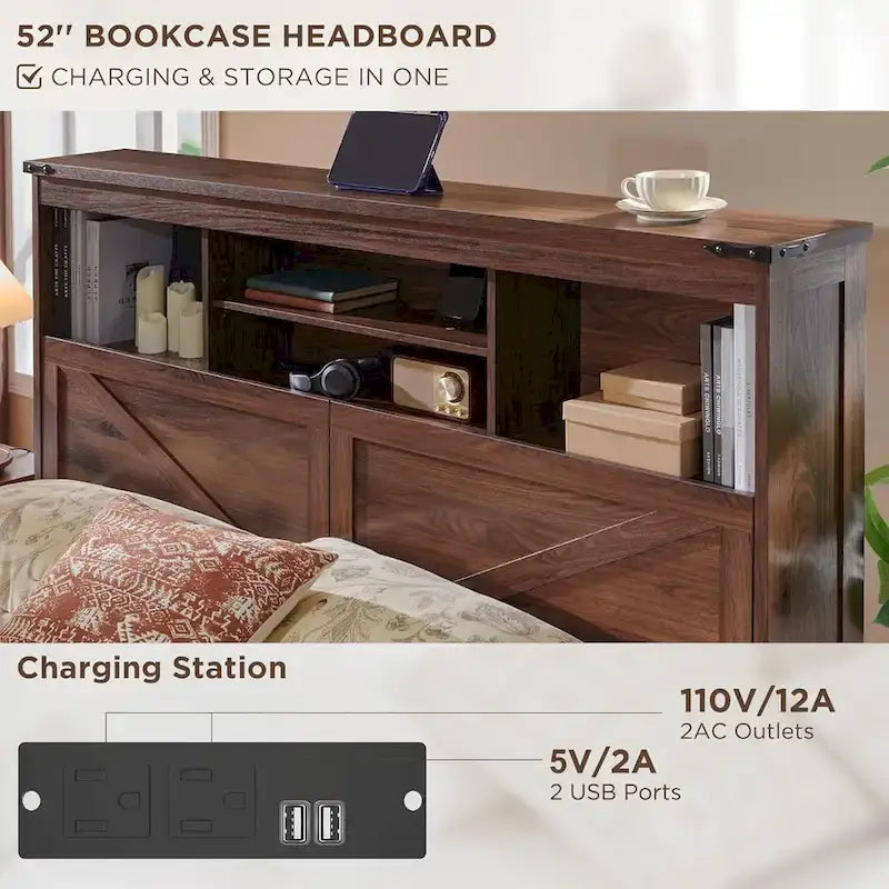 The bed frame features a fancy Bookshelf headboard with a sliding barn door system and a tall footboard with classical farmhouse elements. Its distressed color finish is wonderfully easy on the eyes, and it has natural variations in grain, color, and texture, giving every piece a unique look, and creating a rustic, charming, cozy bedroom retreat. This farmhouse-style bed frame, with a 52-inch high storage headboard and 4 drawers, combines modern technology with classic design to a touch of elegance and practicality to your bedroom. The headboard not only provides extra storage space but also comes with an LED light strip and a charging station, offering 1 adjustable light colors and 4 dynamic modes, easily controlled by a remote, to create the perfect ambiance or use as a night light. The frame is made of sturdy engineered wood a high-strength steel bed slat, with a maximum weight capacity of 900 pounds, ensuring superior stability and durability. Whether you're looking for comfortable sleep or efficient storage, this bed frame is your ideal choice.