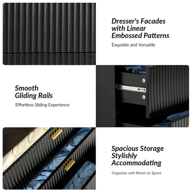 This modern three-drawer dresser offers you an excellent storage solution that is both practical and stylish, making it a versatile addition to your bedroom, living room, or entryway. The three spacious drawers provide ample storage space, allowing you to easily organize and arrange your belongings. Elegant nightstand cabinet featuring a line embossed texture, combining style and functionality to enhance your bedroom dcor. Whether you use it to store clothes and accessories in your bedroom, keep media equipment and accessories in your living room, or store keys and everyday essentials in your entryway, this nightstand is designed to meet your storage needs. With its exquisite design, clean lines, and beautiful finish, it adds a touch of modern sophistication to any space.