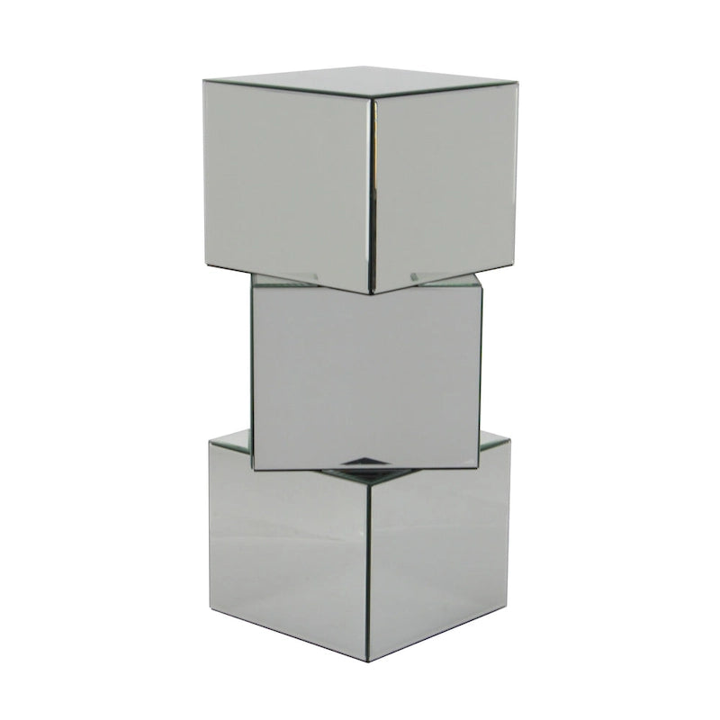 - Mirrored pedestal table highlights three stacked cube silhouette with beveled mirror panels on all sides for a stunning display in any corner of your home