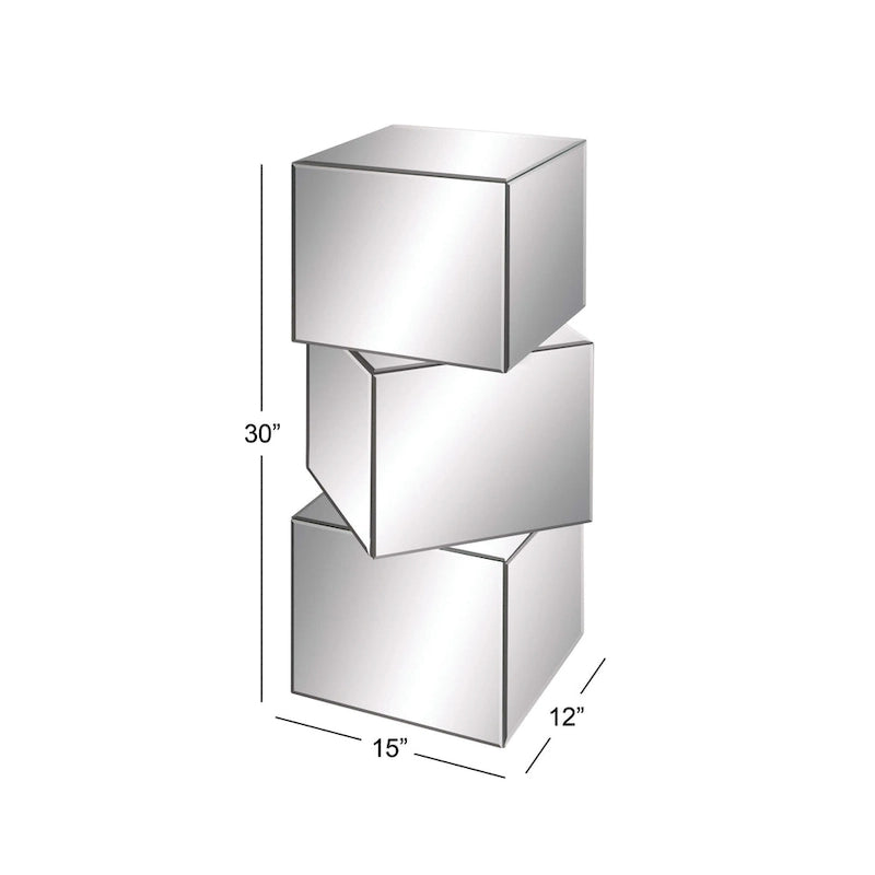 Enhance your room's aesthetic with a practical yet chic upgrade. Showcase your plants, decor, or cherished art pieces on this exquisitely designed pedestal table. The stacked mirrored accent table adds a touch of dazzle to any small space, especially when paired with a tall ceramic sculpture for an artistic flair. This product is delivered in one carton and features wooden cubes adorned with glass mirror accents. Ideal for indoor use, it arrives fully assembled and ready to use. With a maximum weight capacity of 50 lbs., this single silver-colored drink table complements any glam-style decor perfectly.