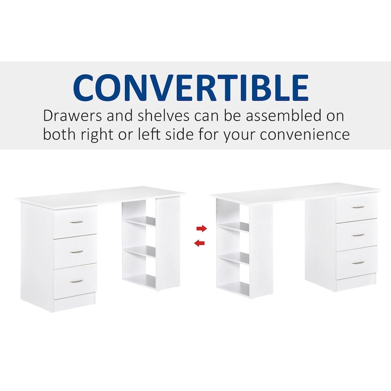 HOMCOM provides modern and quality furniture for your home or office, with most popular current trends tailored to your needs. This white desk with drawers provides spacious room for holding computers and monitors, as well as for keeping office supplies within reach 3 drawers and 3 open shelves for storing and displaying items. Its simple, minimalist design makes it easy to pair with other components to build out a contemporary office set to fit your space.