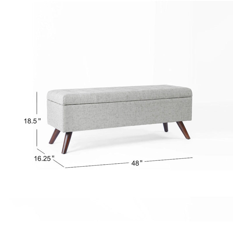 The HomePop Modern Storage Bench features clean, modern lines and stylish wood legs. Great as a coffee table ottoman to serve guests, or as an end of bed bench to store blankets and pillows when not in use. This multi-functional bench provides extra seating in your dining room or living room, or hide shoes and gloves in your entryway. Lift top is protected by a safety hinge from unexpected closures. Button tufting provides style for any room. Easy to assemble and maintain.