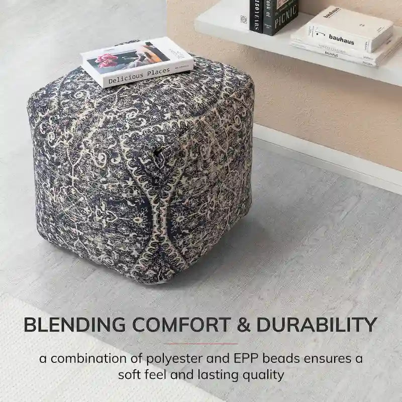 Versatile. Comfortable. Functional. The Jani Hanalei 20-inch Blue & Ivory Square Pouf Ottoman is a perfect addition to any living room, bedroom, nursery, or kids' room. Made from 100% Jacquard-woven polyester, this handcrafted pouf is pre-filled with firm, recyclable Expanded Polypropylene (EPP) beads, offering superior shape recovery. Expertly crafted by skilled artisans and filled in the U.S.A., this pouf provides both durability and consistent comfort with every use. Its cool blue and ivory color adds a stylish, neutral touch to any room.