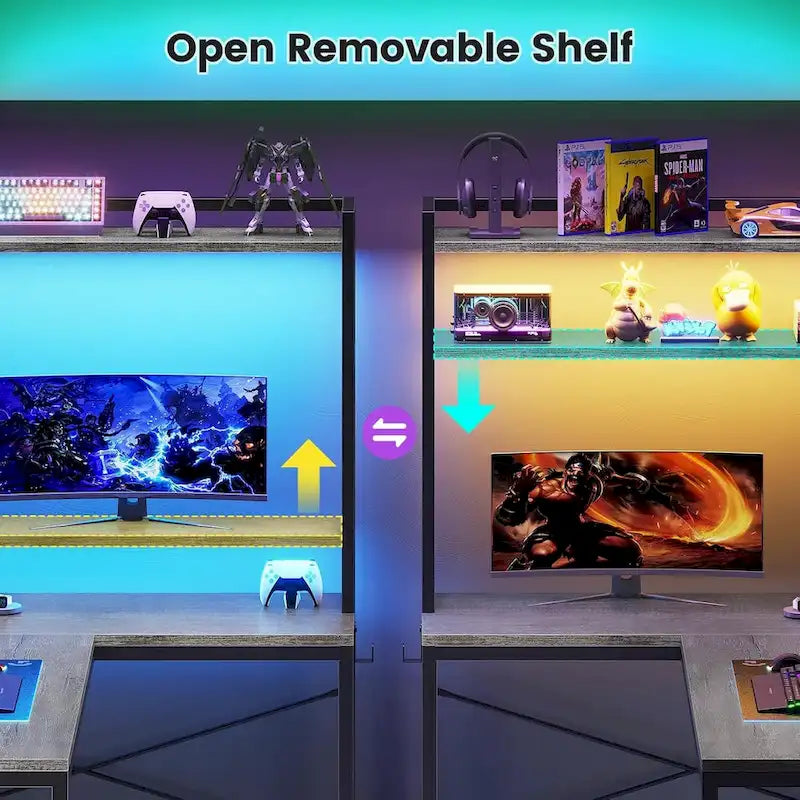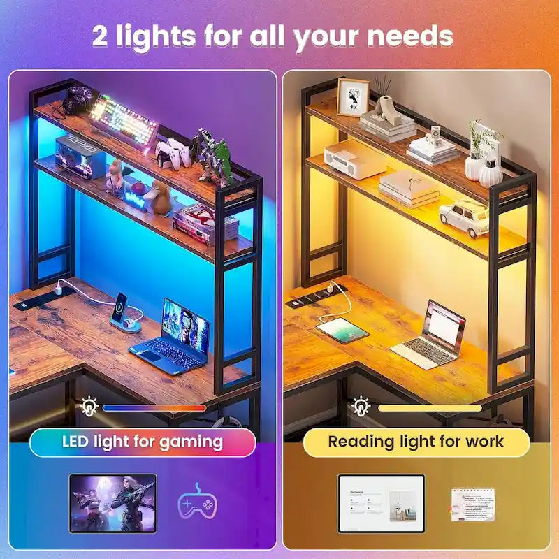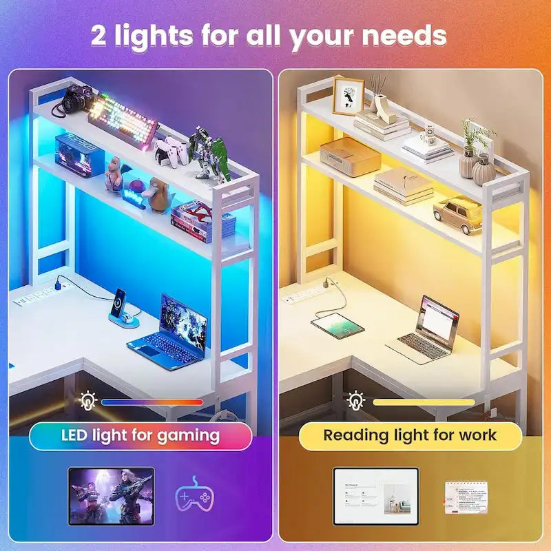 - Cool & Smart Led Light The gaming desk comes with RGB LED light, remote control via APP, Over 60000 colors, and 29 flashing modes for you to choose from. Led lights with music sync function, built-in sensitivity adjustable mic, led light color will change with the rhythm of the sound and music. This l-shaped gaming desk can help you play games for your home offices.