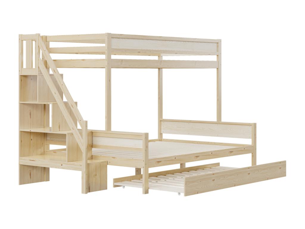 Children's bunk bed 90x200 and 140x200cm with trundle bed 90x190cm, slatted base with steps and shelf in natural wood