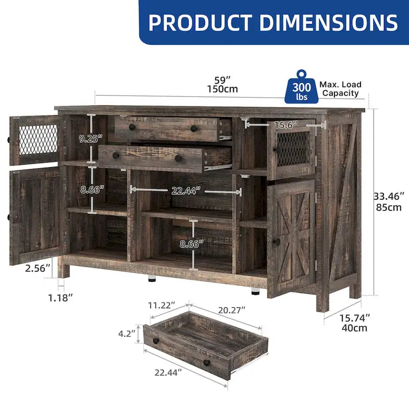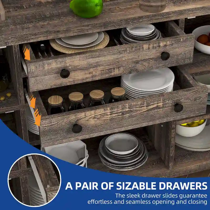 Elevate your home with our farmhouse barn door coffee bar cabinet, a versatile and stylish piece that fits any decor. Offering ample and flexible storage with adjustable shelves, large drawers, and visual grid doors, it's perfect for keeping essentials at hand. This multi-functional cabinet serves various purposes in homes, apartments, and offices. Crafted from high-quality engineered wood, it's sturdy, durable, and easy to clean, thanks to its premium 3D woodgrain paper coating.