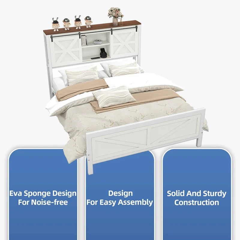 Farmhouse King /Queen Size Bed Frame with Headboard, Bookcase Storage Shelves, Sliding Barn Door, Charging Station, Rustic Wood Platform Bed, No Box Spring Needed, White