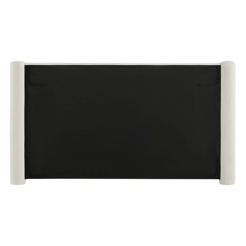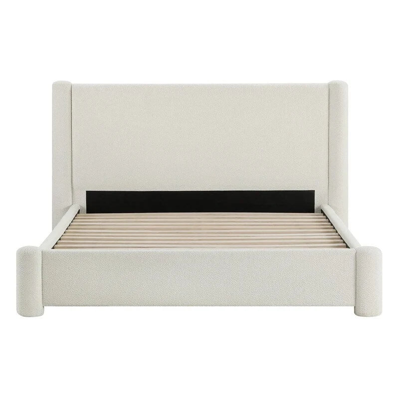This modern platform bed features a wide panel headboard and clean-lined frame, supported by rounded pillar legs that add contemporary geometric elegance. The upholstered bed frame is wrapped in soft, waterproof boucle-style jacquard fabric for both comfort and easy maintenance. Constructed from rubberwood and engineered wood, this durable headboard platform bed features seven solid legs for exceptional stability. The slatted base supports all mattress types, while EVA foam sound insulation in the middle rail ensures a quiet, peaceful sleep experience.