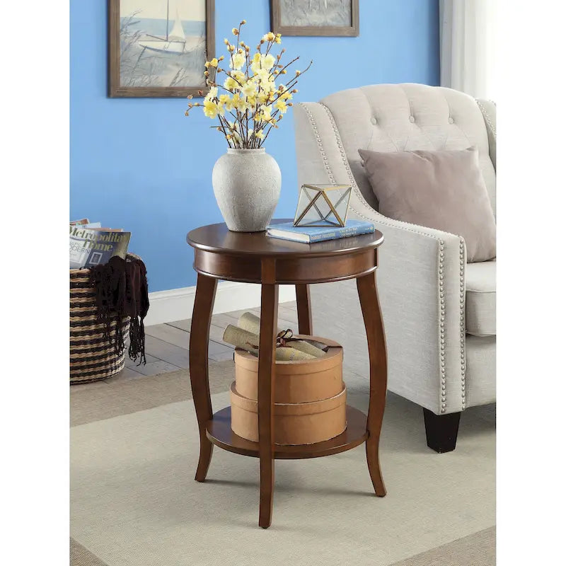 - Product Details : KD, Round Leg Table w/Shelf : Open Storage: Bottom Shelf : Wooden Round Top & Apron : Wooden Cabriole Leg