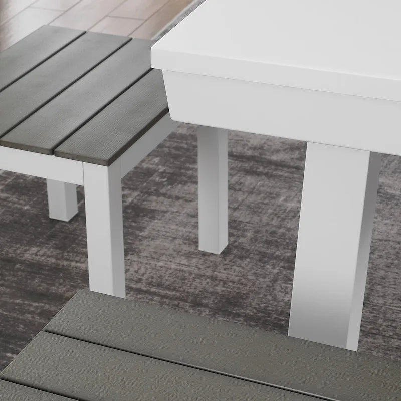 - Includes tabletop and 2 benches for dining conversion