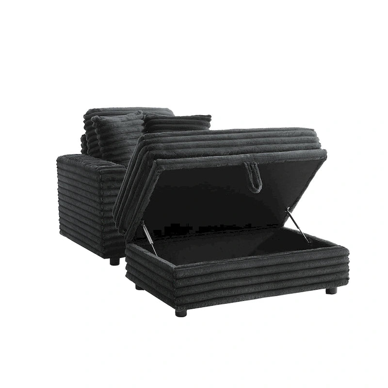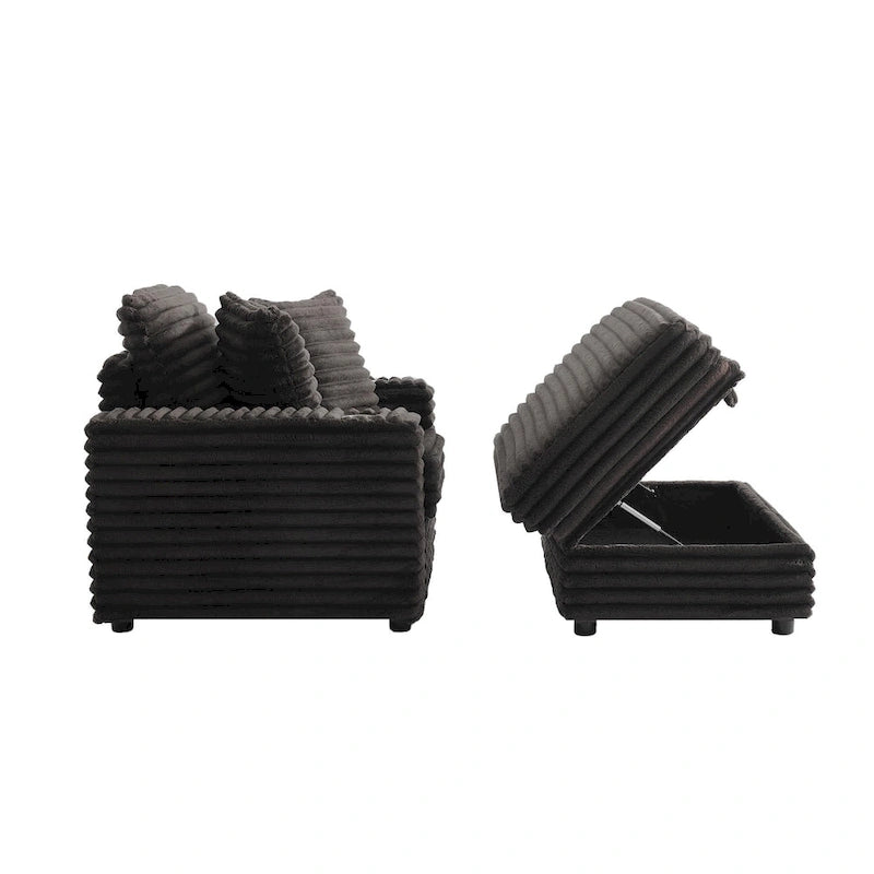 - Ottoman with generous storage space for blankets, pillows, and essentials