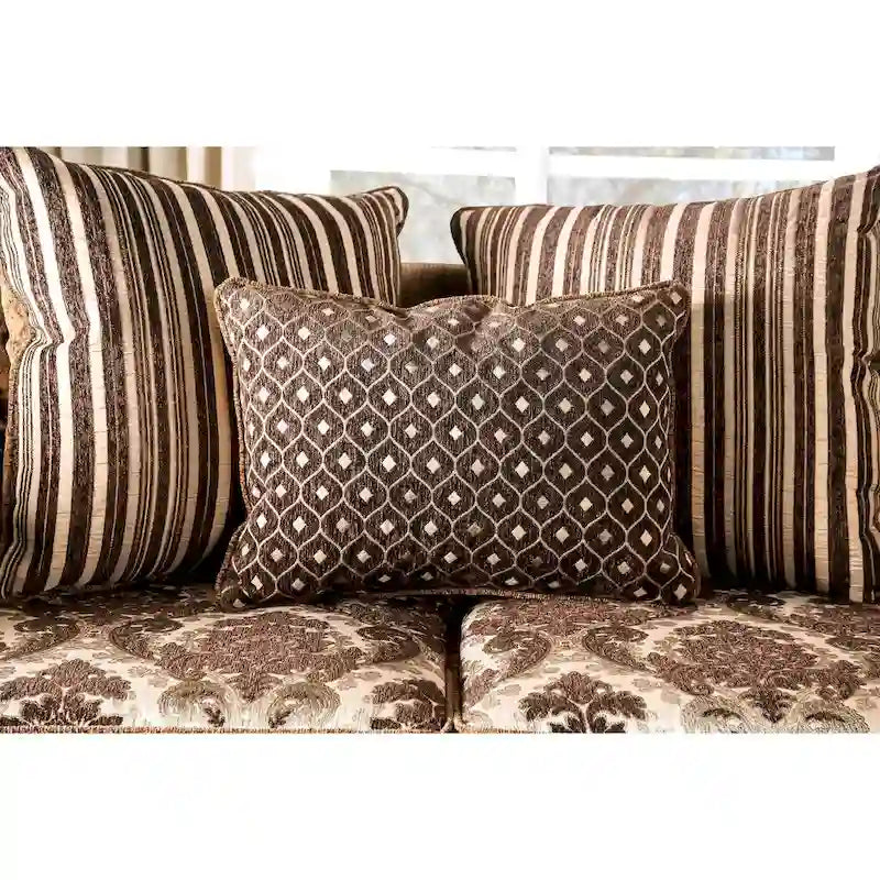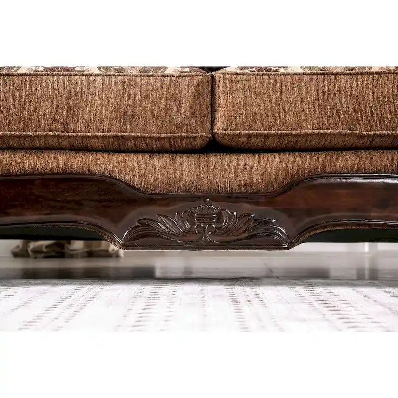 Sink deeply and luxuriously into this soft, chenille sofa for cozy visits with friends or a relaxing afternoon with a good book. With an alluring variety of patterns and solids in warm earth tones, this Pora sofa by Furniture of America brings visual interest to any living room. Wood accents with decorative carvings lend classic elegance and timeless, traditional appeal. Rolled arms and a scrolling wooden frame in a deep, dark walnut finish give any living room a rich and regal atmosphere. Thick back pillows and box cushions with foam filling ensure luxurious comfort that makes you feel truly at home.