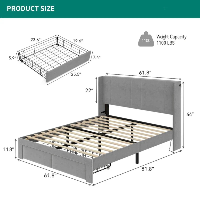 Queen Upholstered Bed Frame with Storage Drawers Headboard Built-in 4 USB Platform Bed