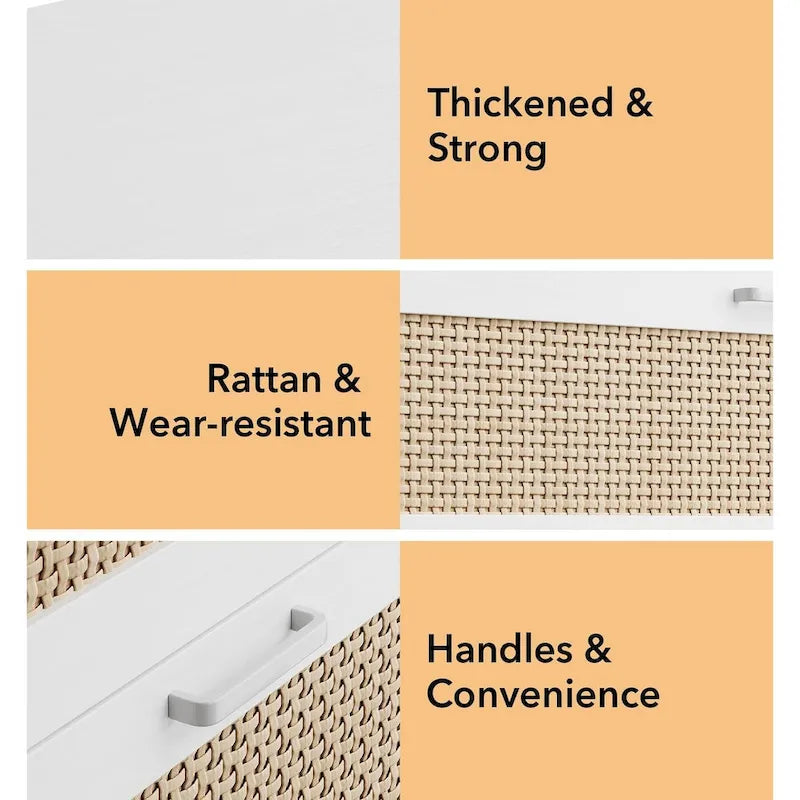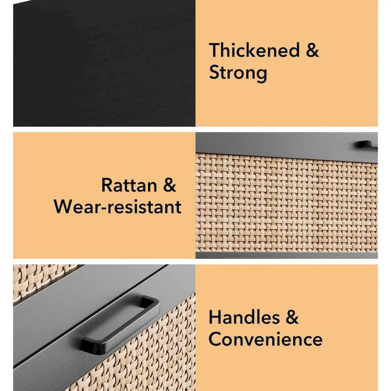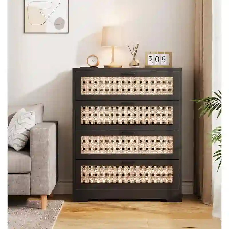 Rattan Dresser - Organize with Nature: This wooden rattan drawer dresser is a solution for those seeking both durability and aesthetic appeal. With its robust structure and chic rattan detailing, can store your essentials while elevating your decor. 4 Drawer Chest - Clutter-Free: Features 4 drawers for size 13.86D x 30.31W x 8.46H, The spacious drawers allow for efficient storage of clothes, linens, and beauty essentials, helping you get a clutter-free space that enhances your daily routine! Dresser with Power Outlets - Smart Charging: No more searching for a power outlet and trouble with tangled cables! Our bedroom dresser features a built-in power outlet, and the cable management hole at the back keeps everything organized. Storage Solution - Versatile Style: Our wood rattan dresser is suitable for any area of your homebe it the entryway, hallway, bedroom, living room, or closet, helping you maintain an organized environment in any space you choose. Add a stylish touch wherever you need it most! Specification - Details: Overall Dimensions: 15.75D x 31.49W x 38.58 H. We offers clear, user-friendly instructions, you can easily assemble the tall dresser with 4 drawers, get a new rattan dresser in a short time.
