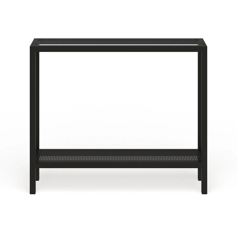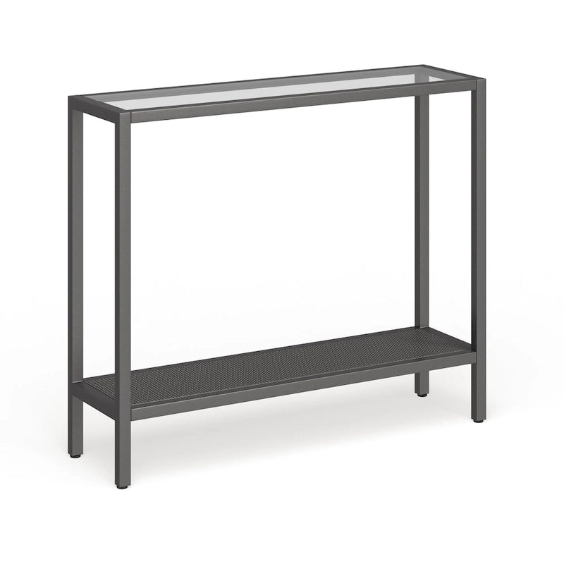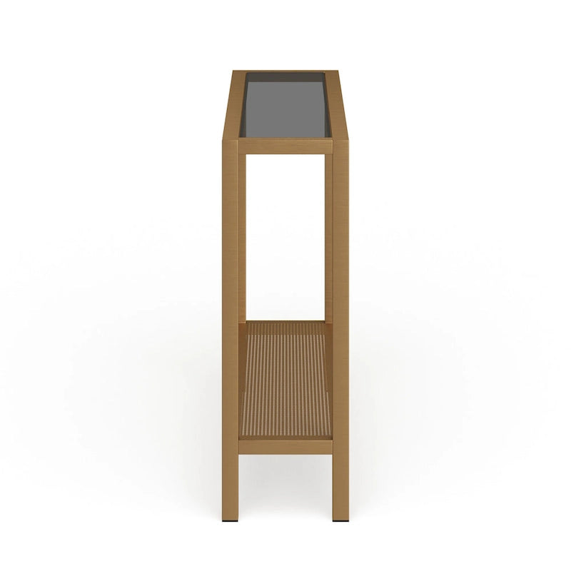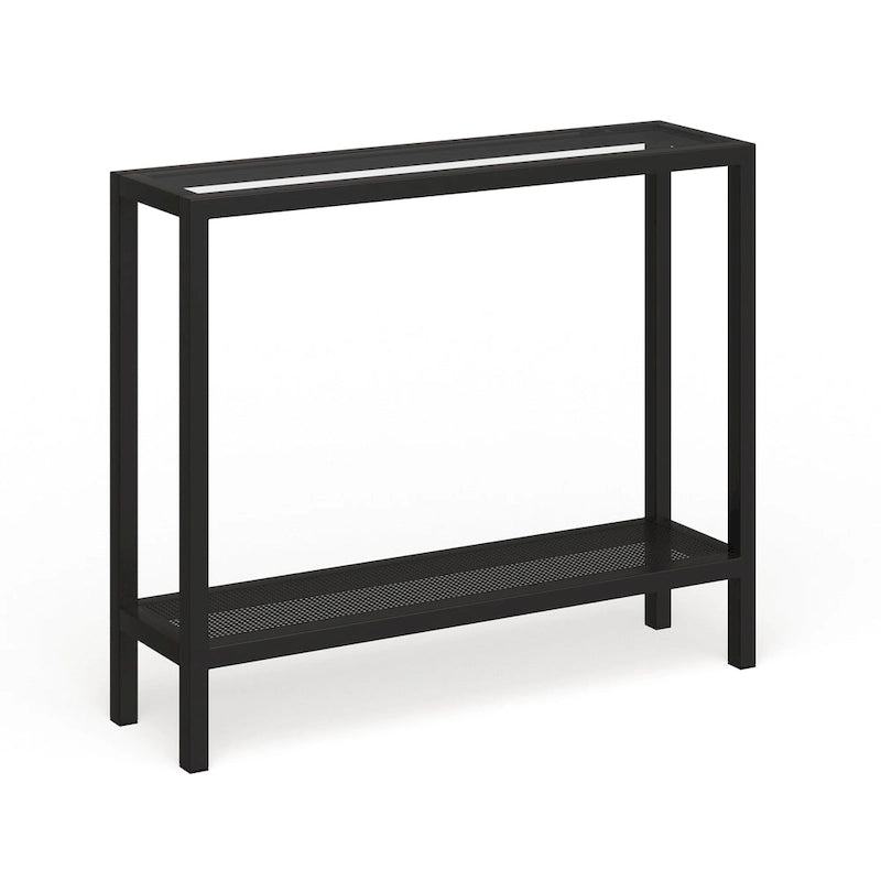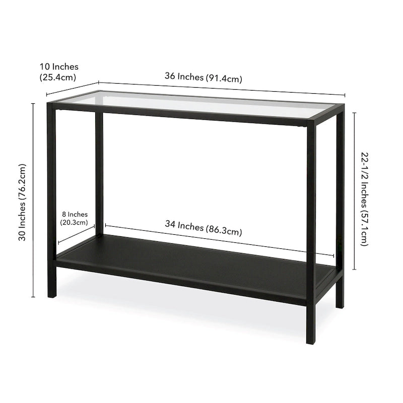 Add a touch of contemporary charm to your living space with the Rigan Modern Metal and Glass Console Table. The sleek design features a sturdy steel frame and a clear tempered glass top, available in your choice of three stunning metallic finishes to complement your decor. With two open shelves, this console table provides ample storage and display space for your belongings. Handcrafted for a personalized touch, this easy-to-assemble table can hold up to 50 lbs. Choose from four size options to fit your space perfectly.