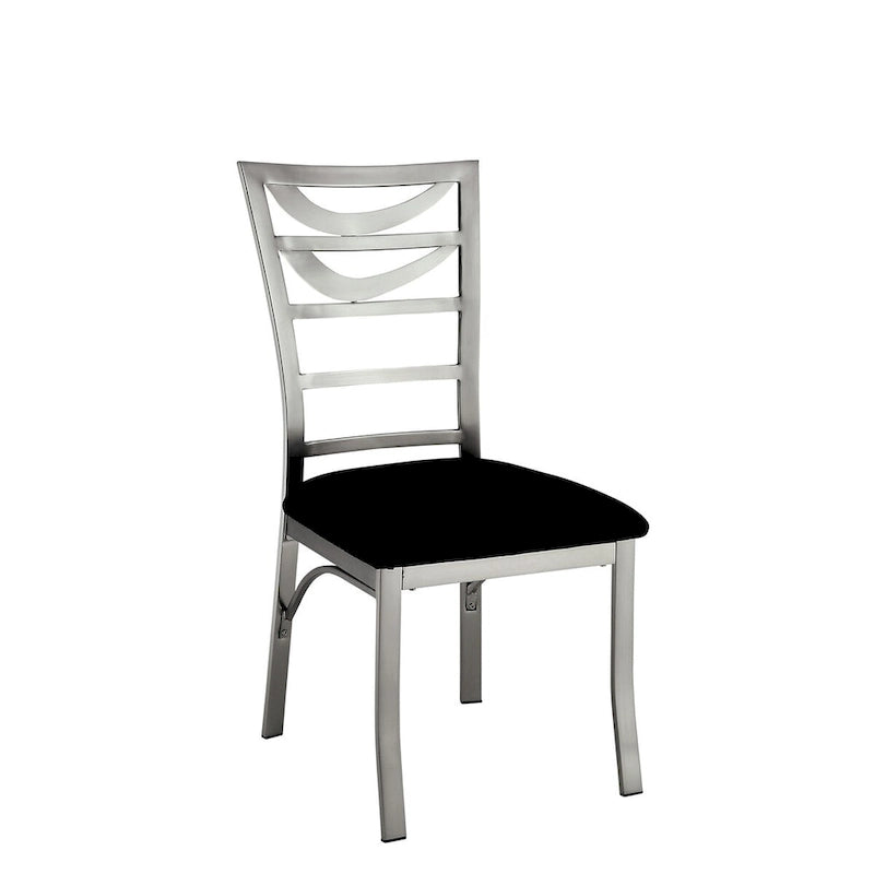 Perfect for a modern dining area, this five-piece contemporary dining set is by Furniture of America. This striking table features a double helix pedestal base that lends a graceful look. It pairs with a two-tone finish in lustrous silver satin and dark black. A spacious round tabletop is made of tempered glass. Chairs feature ladderbacks with double curved interior accents. Each chair also features a padded cushion and deep black microfiber.