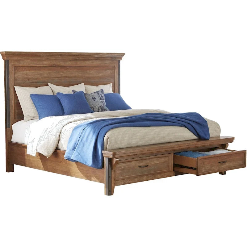 The Taos Panel Bed in Canyon Brown is the epitome of rustic elegance. Available in your choice of king or queen sizes, this bed is constructed from solid pine and pine veneers with select hardwoods and industrial metal accents. The headboard displays gorgeous detailing and natural wood texture, while the studded metal detailing provides a unique, rustic touch. The optional storage footboard adds 2 drawers of convenient under-bed storage. Welcome home with the Taos Panel Bed.