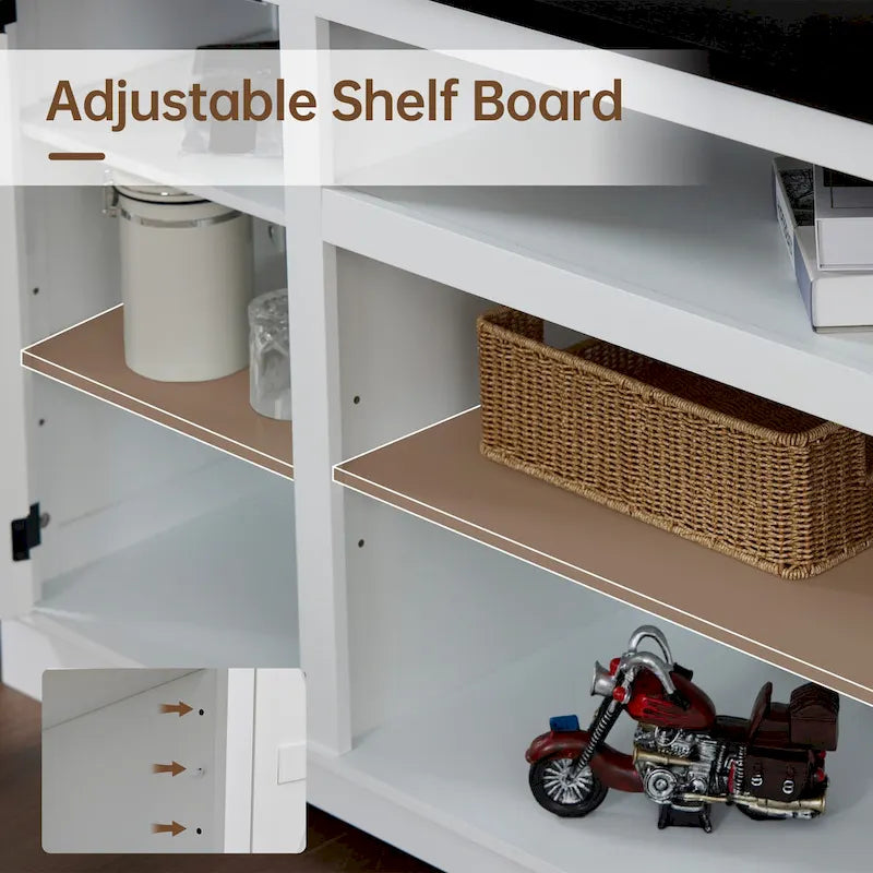 3.HUGE STORAGE SPACE: The overall 66W x 16D x 26H huge storage space, divided into 9 compartments, make you easily plan and organize your items. The interior is designed with an open center cabinet and two side cabinets with flush doors. Each cabinet has an adjustable shelf in the middle (3 height adjustable), so you can customize the size of storage space according to your needs.