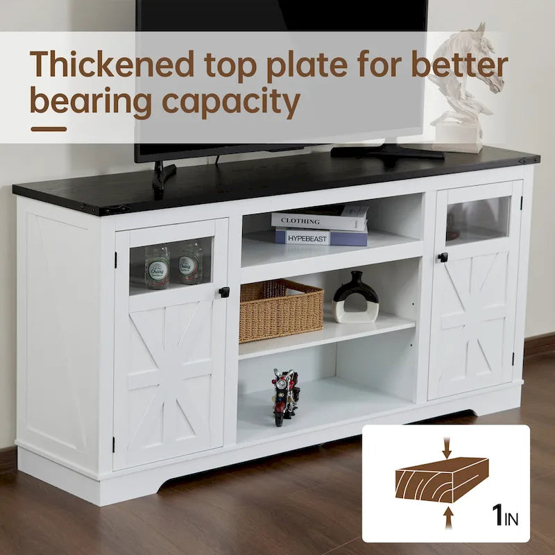 1. FARMHOUSE STYLE TV STAND: Our 66-inch TV stand is designed in a style that blends farmhouse elements with a modern look, using a combination of vintage traditional flush doors and modern clear glass decor, with an overall structure of sleek lines for a beautifully atmospheric look. Smooth lines and a neutral colour scheme add a stylish touch to the rustic farmhouse.
