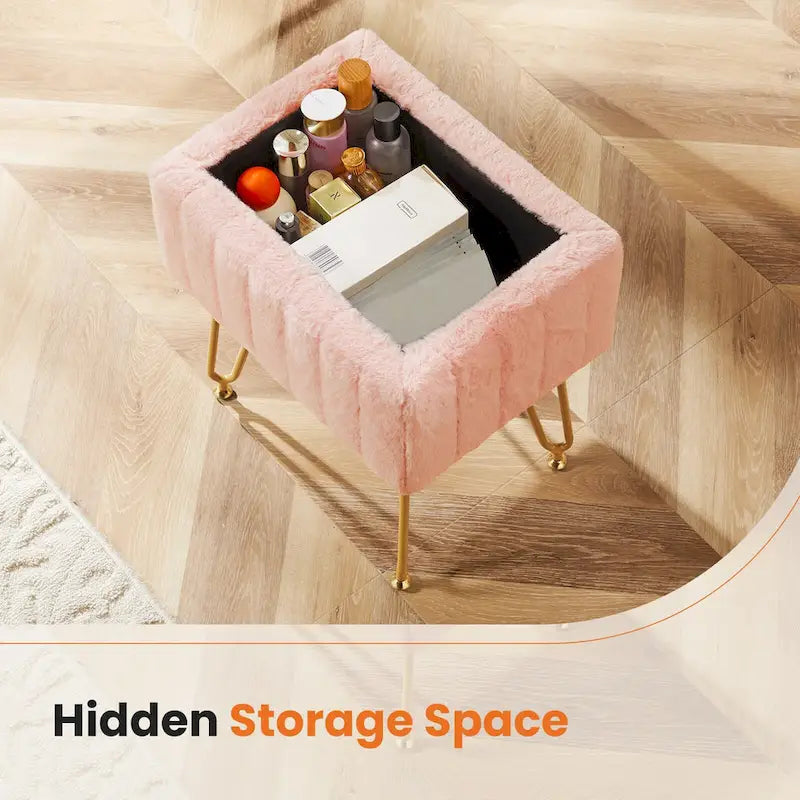Vanity Stool Chair with Storage, Ottoman Faux Fur Soft Padded Makeup Footstools Seat with 4 Metal Legs Anti-Slip Adjustable Feet