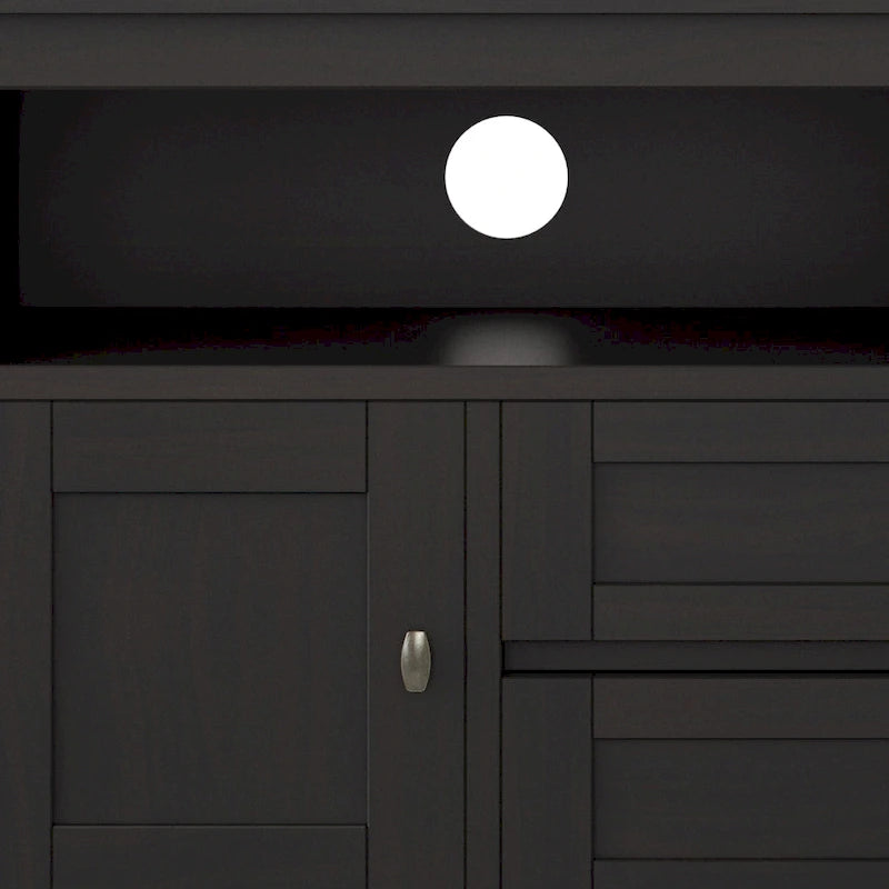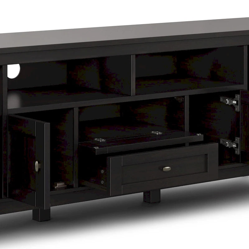 Now that 80 inch flat screen TVs are more affordable, you need to have one. To enjoy it fully, you will also need the perfect TV Stand to position your TV just right. Look no further. The Norfolk Extra Wide TV Stand is perfectly sized for TVs up to 80 inches. It has plenty of storage space for all your media and gaming devices. It has a large centrally located open area with two drawers as well as two enclosed spaces. The two large side storage cabinets open to one adjustable shelf each. The unit features cord management cut-outs for easy installation of TV and media components.