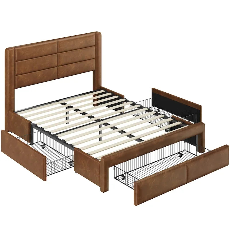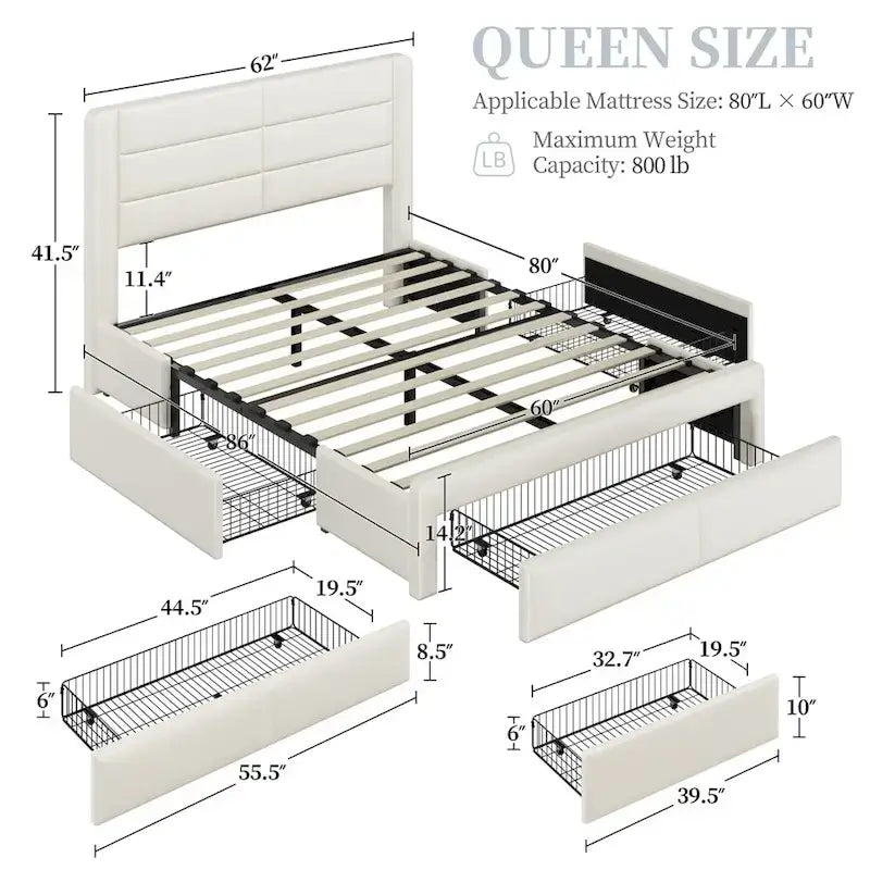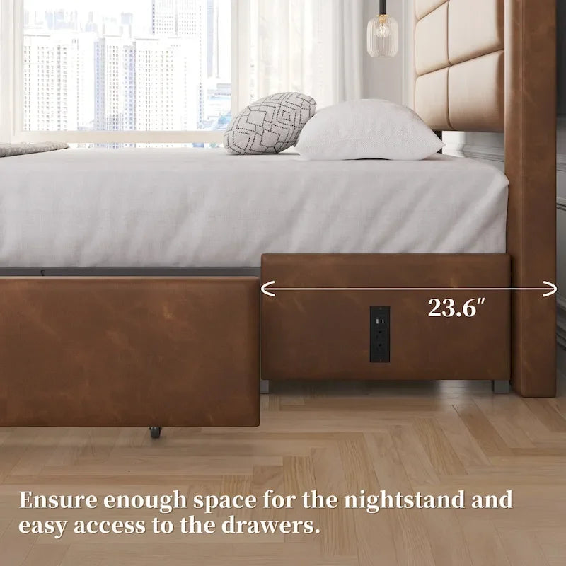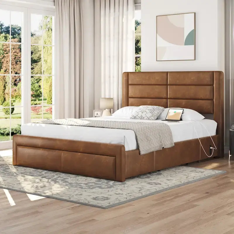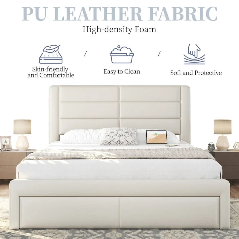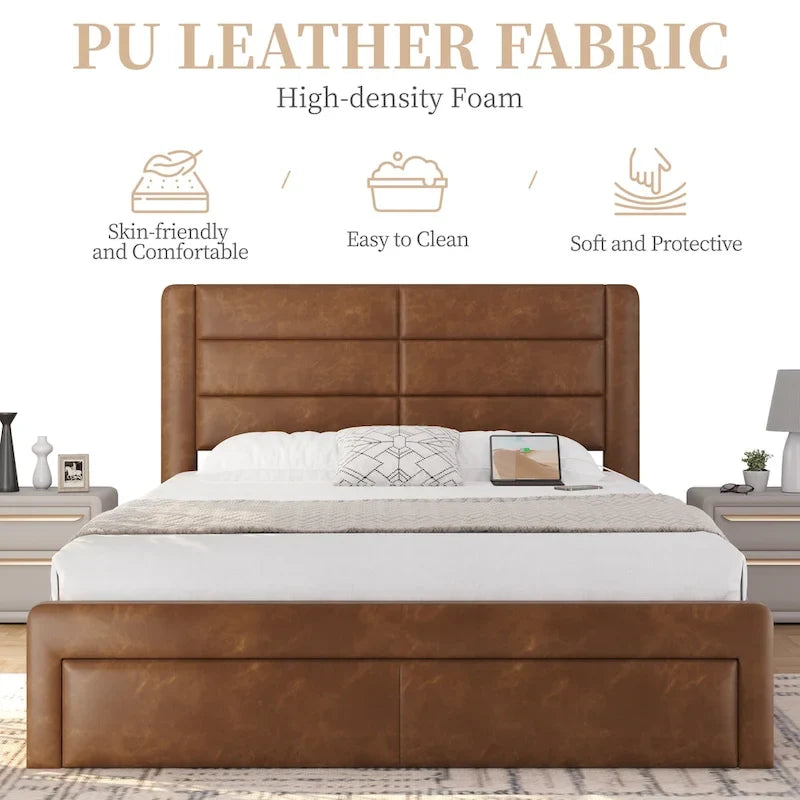 This upholstered platform bed with drawers has a modern yet classic design style and is a durable performer for any bedroom setting. It comes in traditional PU leather colors and is filled with high-resilience foam, making it comfortable and easy to pair with any bedding and bedroom decor. The storage drawers provide convenient storage space for organizing your off-season clothing, creating extra storage space and providing more room for a clean and tidy bedroom space. Fitted with two AC outlets and USB ports on one side of the headboard, you never need to pull an extra power cord or worry about no charging ports for electronic devices.
